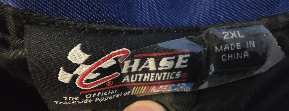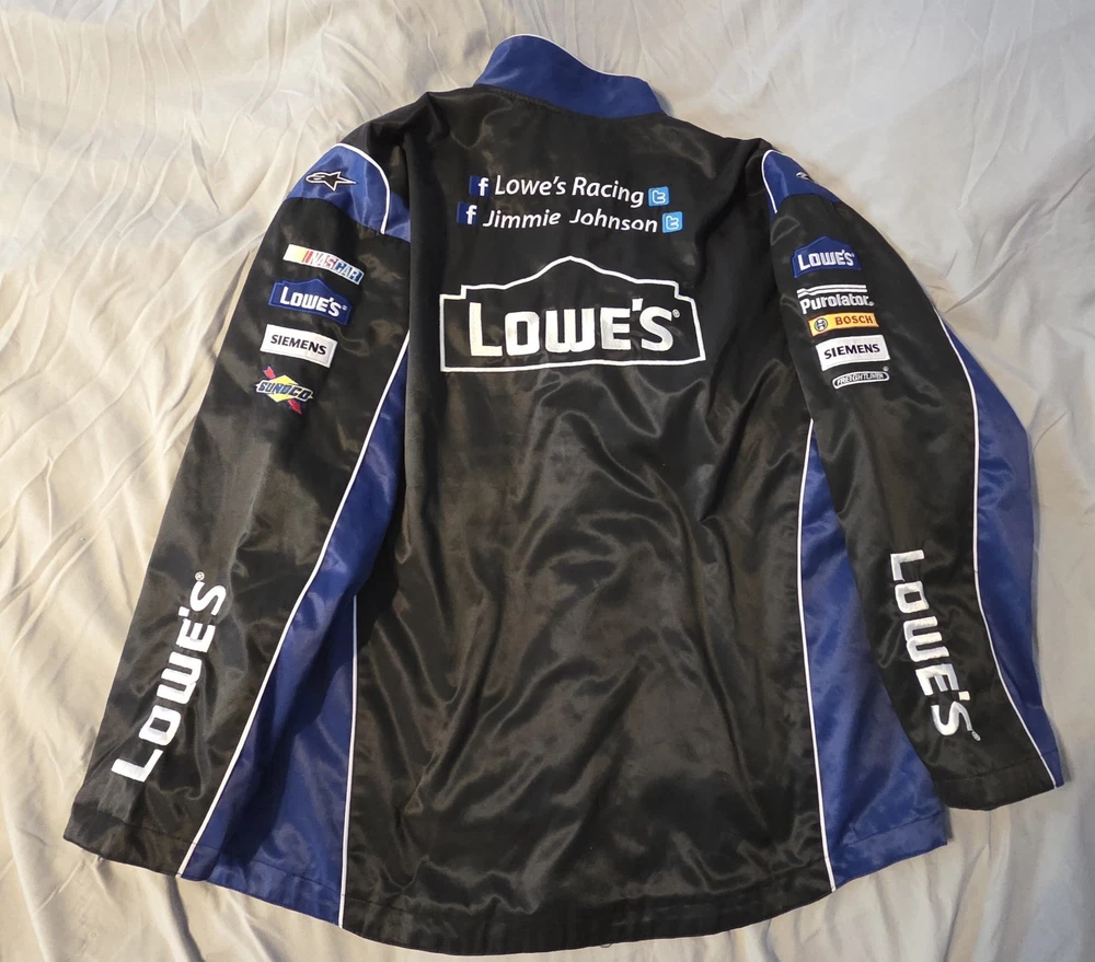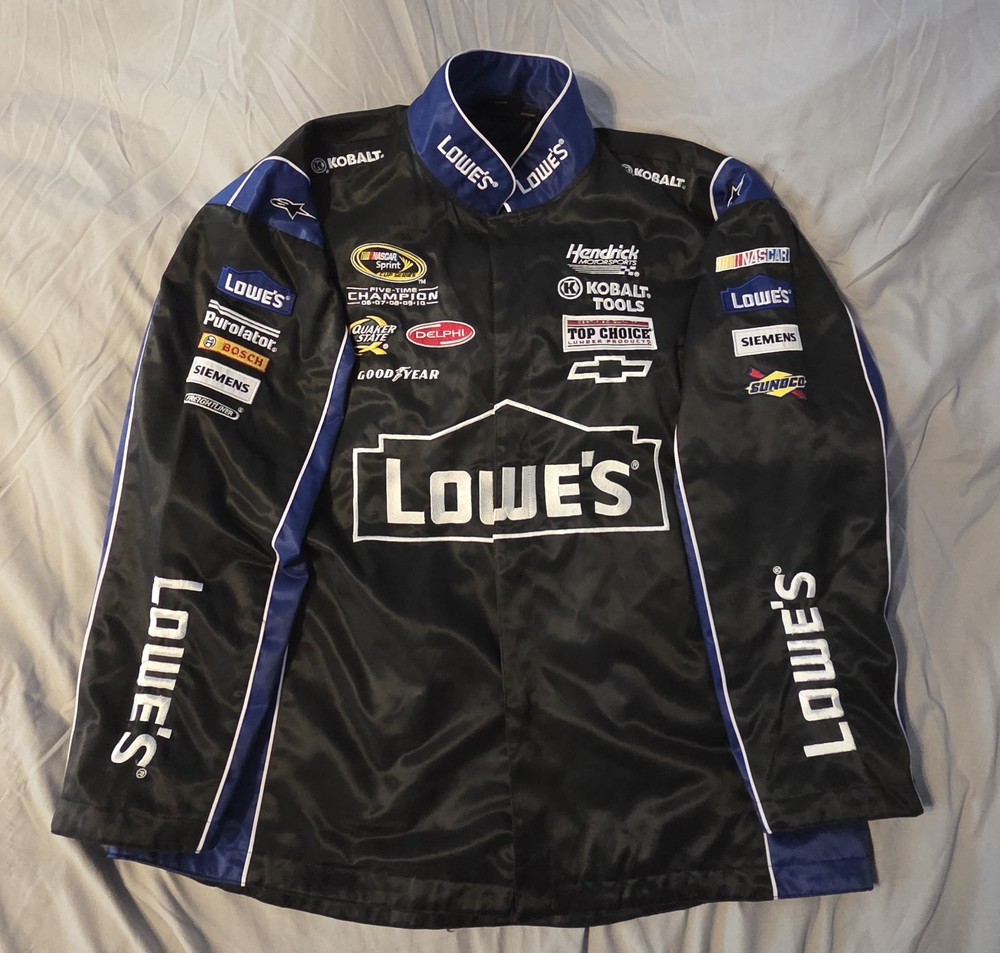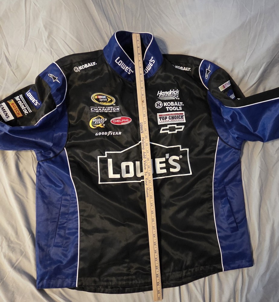 The NASCAR JH Design Jimmie Johnson Racing Lowes Black Jacket is a stylish and versatile piece of fan apparel for men who love auto racing. Made by the renowned brand JH Design, this jacket features the iconic colors of black with blue trim, representing the Hendrick Motorsports team and driver Jimmie Johnson. The jacket is designed in men's size 2XL, making it perfect for fans who want to show their support for their favorite racing star in a comfortable and fashionable way. Whether you're at the racetrack or watching from home, this jacket is a must-have for any NASCAR enthusiast. Jimmie Kenneth Johnson is a seven-time NASCAR champion and professional auto racing driver. In August 2023, Johnson was voted into the NASCAR Hall of Fame as part of the 2024 class. Johnson and his wife Chandra also established the Jimmie Johnson Foundation in 2006 to support children, families, and communities in need across the United States. The foundation has donated more than $13.3 million to charities and public schools. No snaps at the bottom, by design, not due to damage. See Picture Width 28 Length 35 sponsors Purlolator Bosch Siemens Freightliner Quaker State Delphi Goodyear Kobalt Tools Top Choice Lumber Products Sunoco