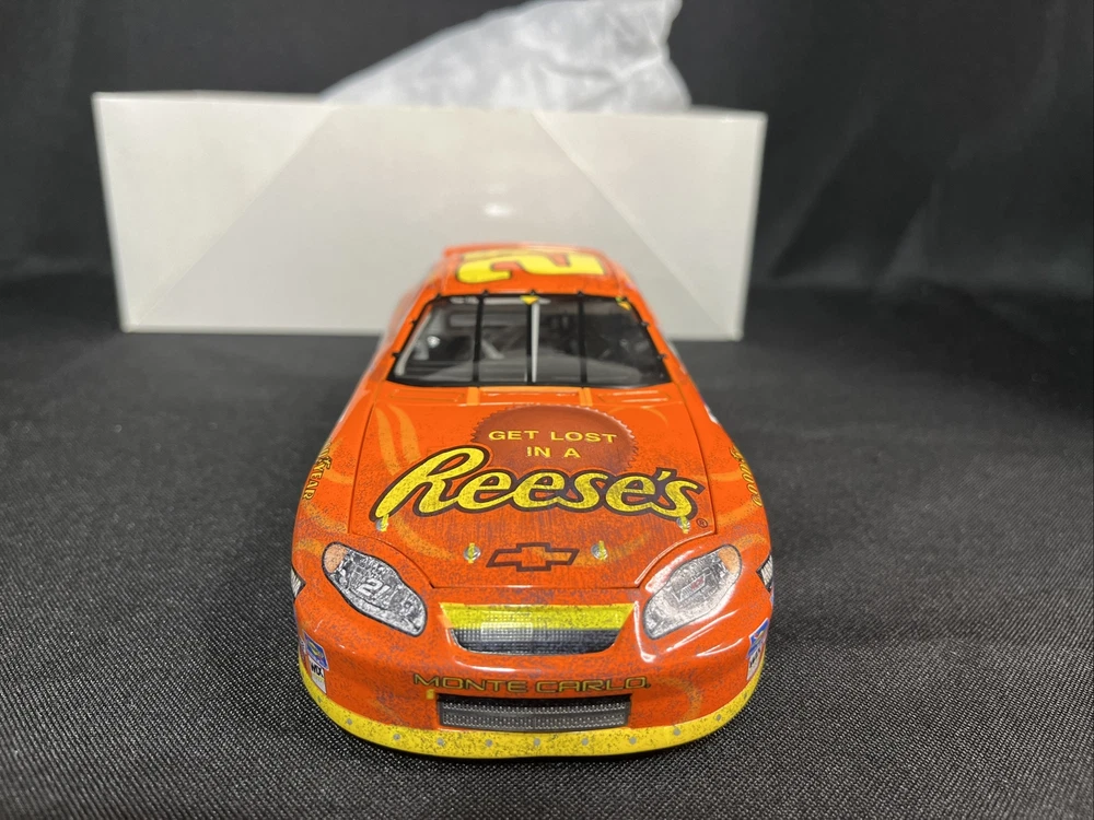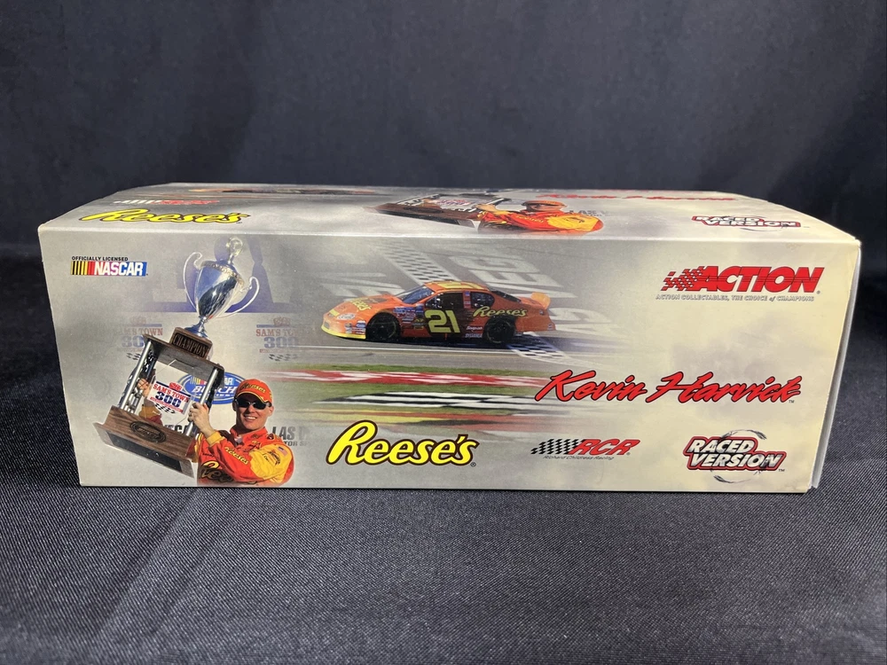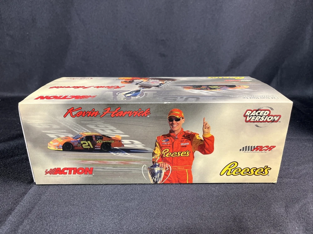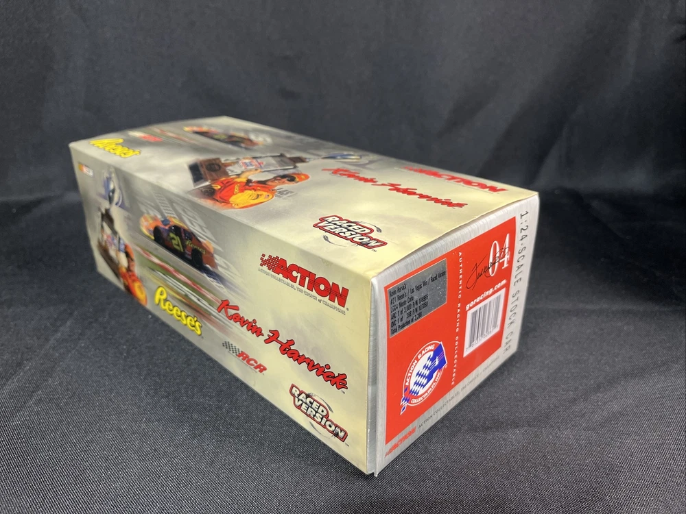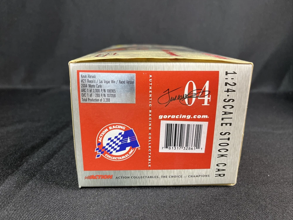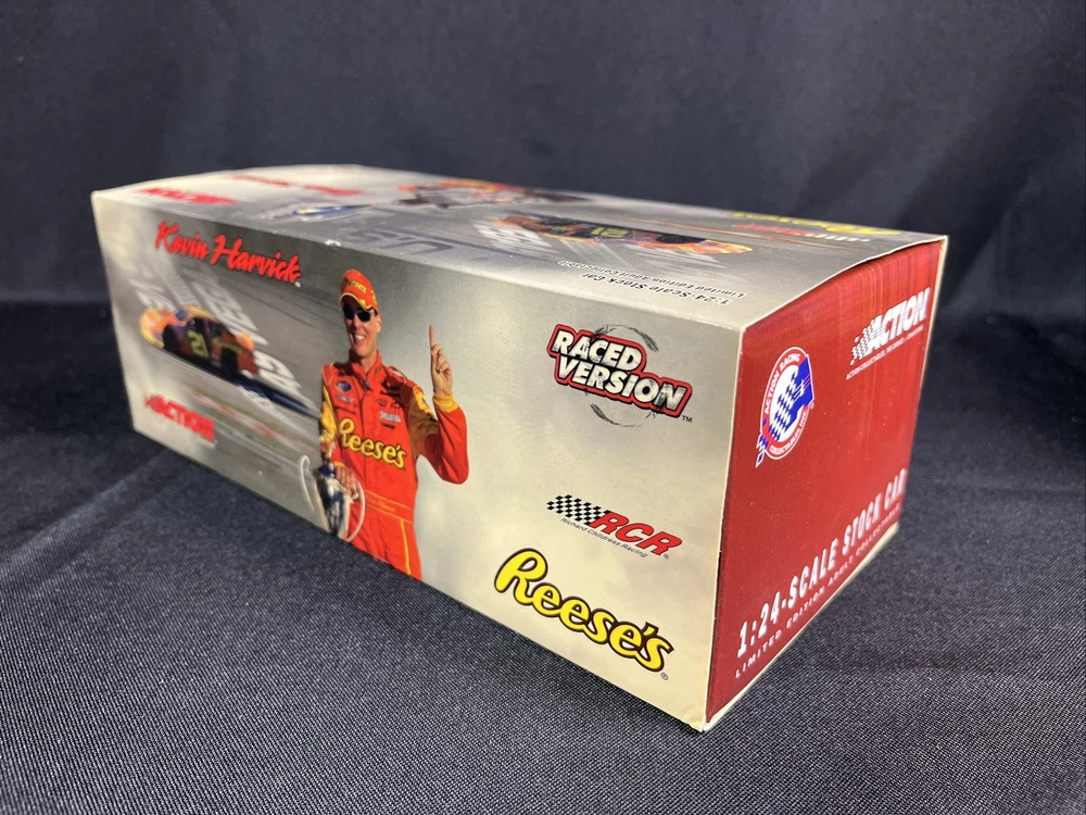 This is a used 1:24 scale diecast NASCAR racecar model of a Chevrolet Monte Carlo driven by Kevin Harvick in 2004. It features a Reese's/Las Vegas Win/Raced Version theme and is from the racing team RCR. The car is in orange yellow color and is manufactured by Action. Packaging may show signs of wear. SB