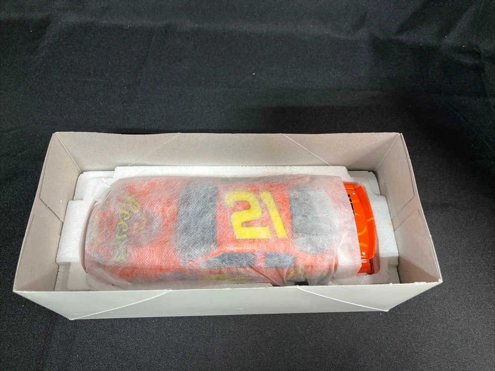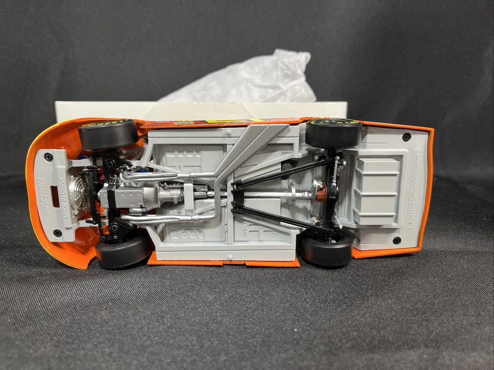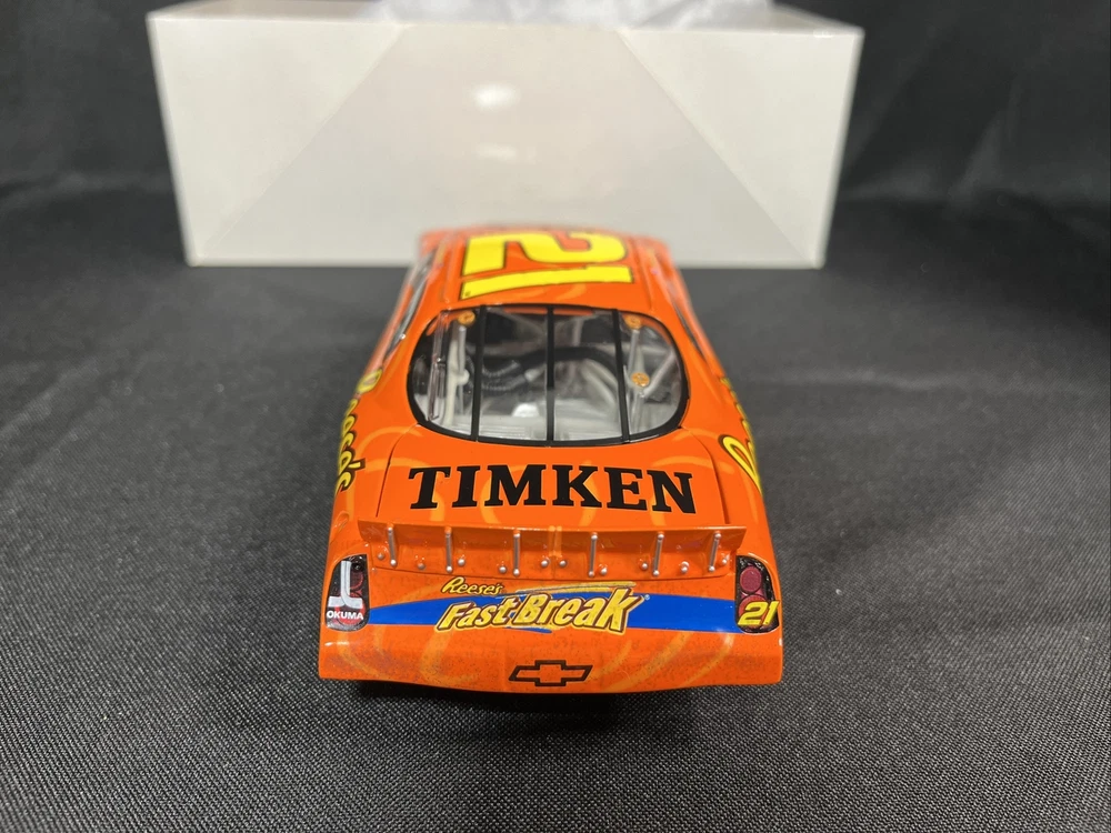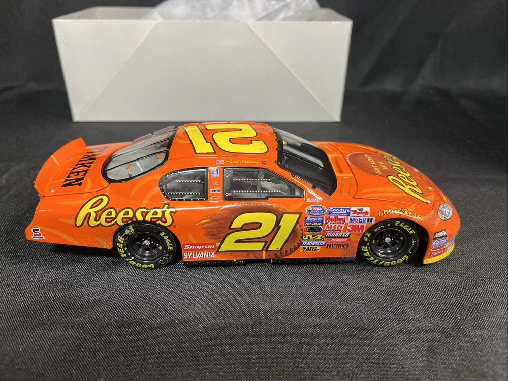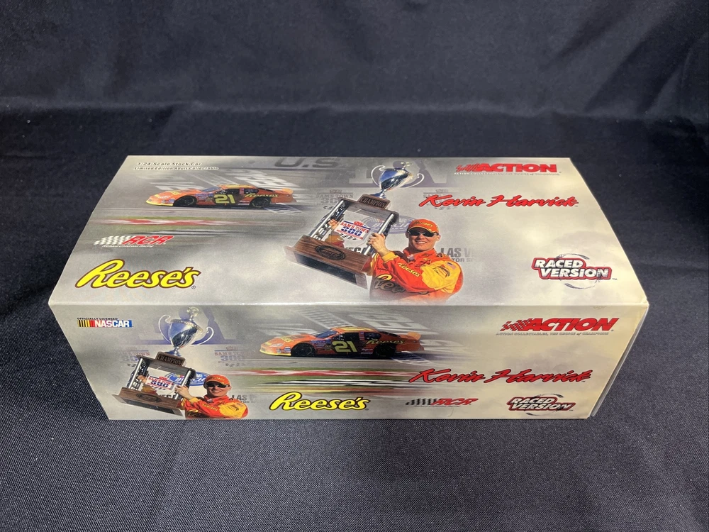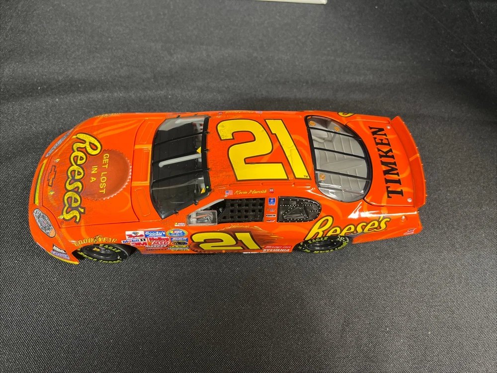 This is a used 1:24 scale diecast NASCAR racecar model of a Chevrolet Monte Carlo driven by Kevin Harvick in 2004. It features a Reese's/Las Vegas Win/Raced Version theme and is from the racing team RCR. The car is in orange yellow color and is manufactured by Action. Packaging may show signs of wear. SB