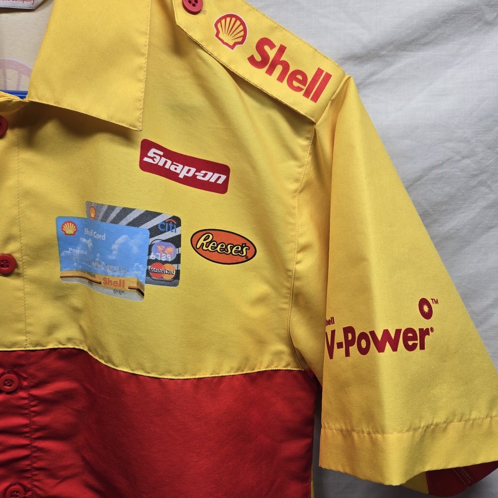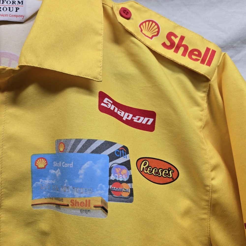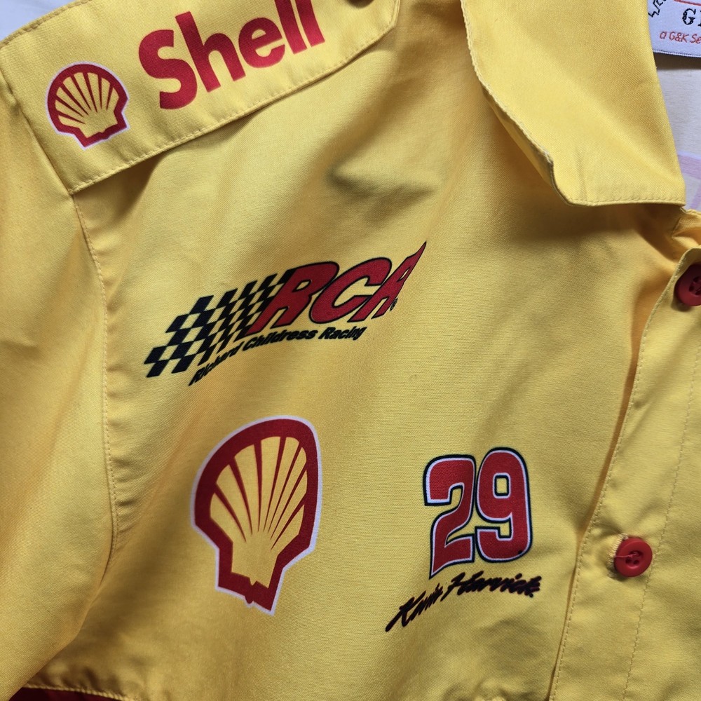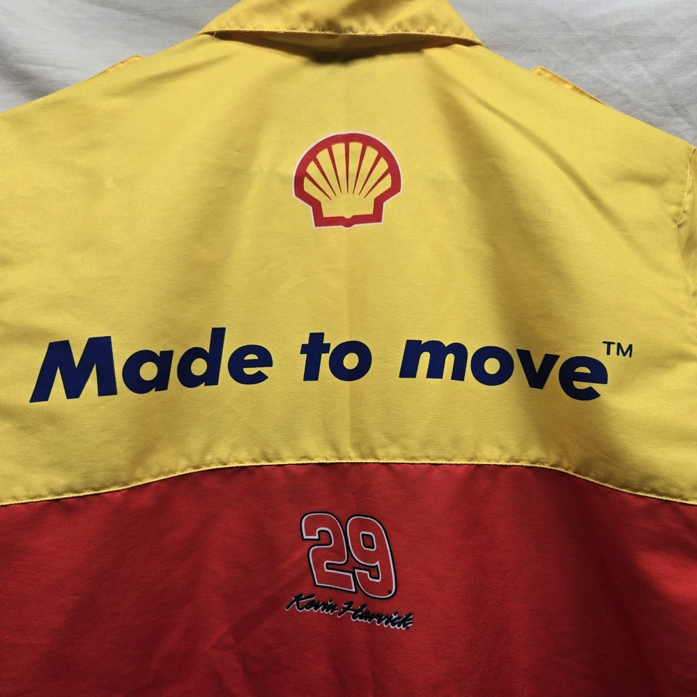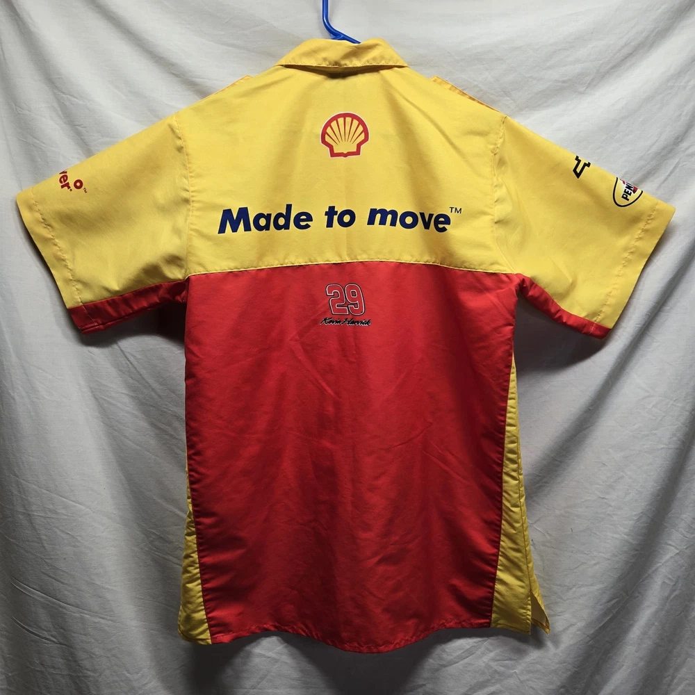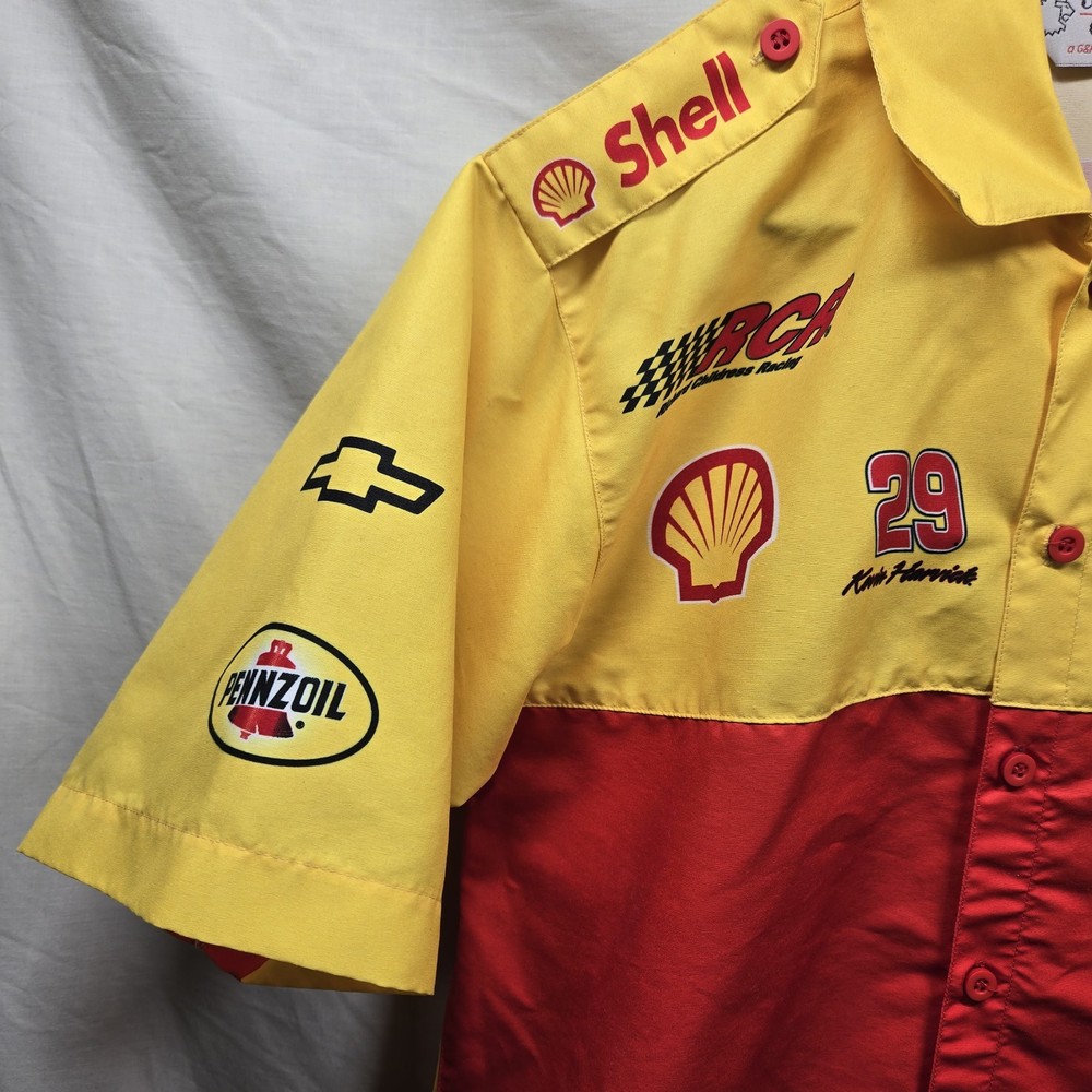 The product is a men's medium NASCAR Kevin Harvick Shell Racing pit crew polo shirt uniform from the team Richard Childress Racing. The shirt is designed in the team colors of yellow and red, representing the auto racing sport. It features the driver's name, Kevin Harvick, and is a must-have for fans of the NASCAR league and auto racing enthusiasts. This shirt is a unique collectible item that allows fans to show support for their favorite driver and team in a stylish and comfortable way.