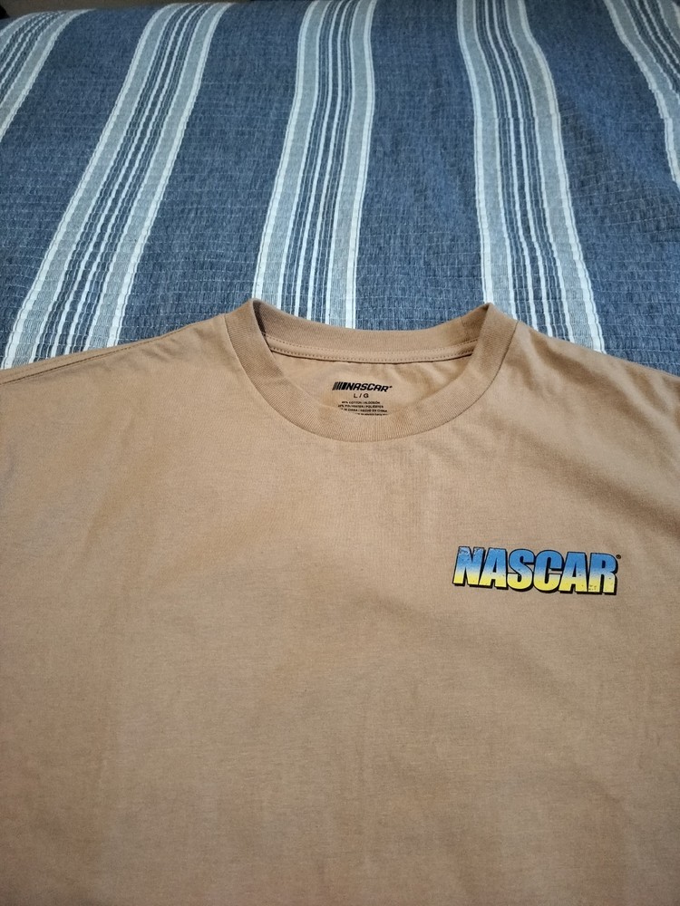 The product is a tan men's NASCAR T-shirt in size L, featuring Dale Earnhardt Jr. as the player. It is officially licensed by NASCAR and is perfect for fans of auto racing. The shirt showcases the brand's logo and is ideal for displaying team spirit at races or casual outings. Made from comfortable material, this shirt is a must-have for any NASCAR enthusiast.