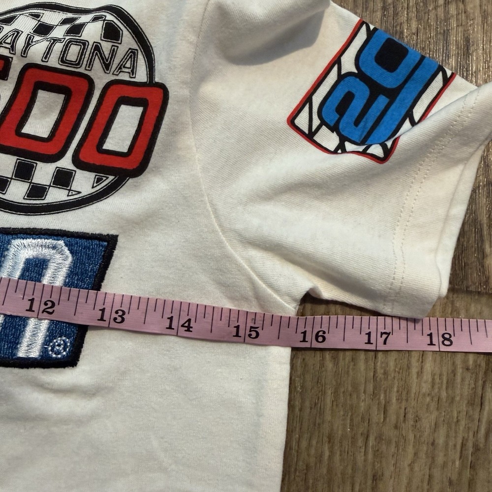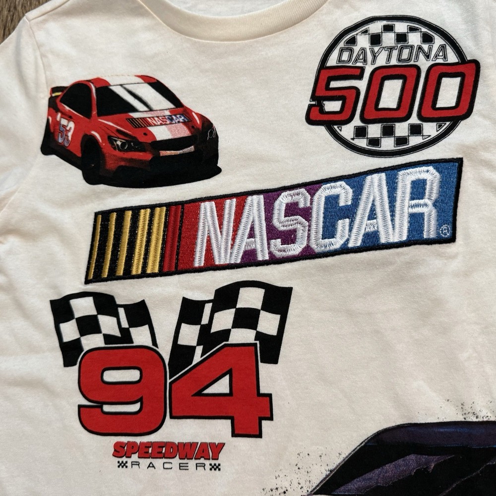 Boys NASCAR Daytona 500 graphic T-shirt featuring a detailed embroidered racing car design for a textured, high-quality look. This short-sleeve tee has a classic crew neckline and a comfortable regular fit, making it perfect for everyday wear, school, or play. Soft cotton jersey fabric that’s lightweight and breathable. New without tags — brand new and unworn; original tags are not attached. ✔️ Embroidered graphic detail ✔️ Soft, lightweight feel ✔️ Easy pullover style ✔️ Great for racing & NASCAR fans Measurements (Approx.) • Chest (pit to pit): 14–14.5 inches • Length (shoulder to hem): 19–20 inches Details • Department: Boys • Size: 6 • Color: Cream / Off-White • Style: Graphic Tee • Collar Style: Crew Neck • Fabric Wash: Medium • Activity: Casual, Play, School Please review measurements for best fit. Fast shipping from a smoke & pet free home.