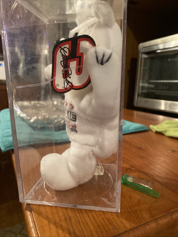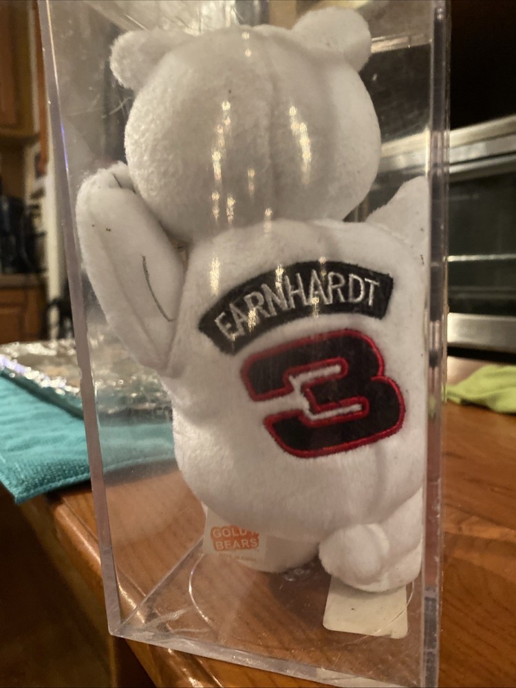 The NASCAR White Bear #3 featuring Dale Earnhardt, a 7-time Winston Cup Champion, is a plush figure from Gold n Bear. This collectible item comes in a case and is designed for unisex adults who are fans of auto racing, specifically NASCAR. The bear is adorned with the colors white, black, and red, reflecting the iconic colors associated with Dale Earnhardt's racing career. Made in China, this unique product celebrates the legendary driver and his achievements in the sport of racing.