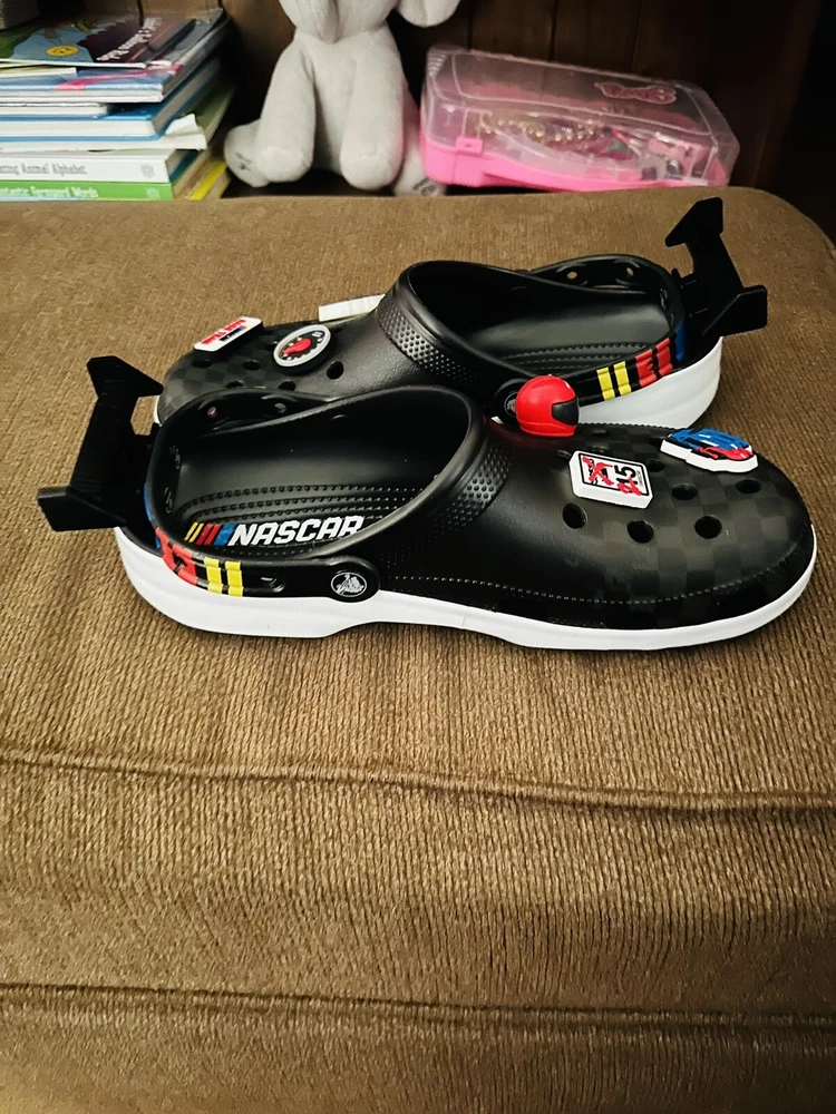 Get ready to race in these stylish NASCAR Crocs Classic Clog shoes! Slip them on with ease, thanks to their convenient slip-on closure feature. These shoes come in a sleek black color with round toe shape and standard shoe width. The upper material is made of rubber, while the outsole and insole are also made of breathable and comfortable rubber material. The Crocs Classic Clog shoes are perfect for casual wear and are a great addition to any wardrobe. They are designed for both men and women, with UK shoe size 8 and US shoe size 9. The shoes are not customized and are part of the Crocs Clog product line. The theme of the shoes is NASCAR, making them perfect for any fan of the sport.