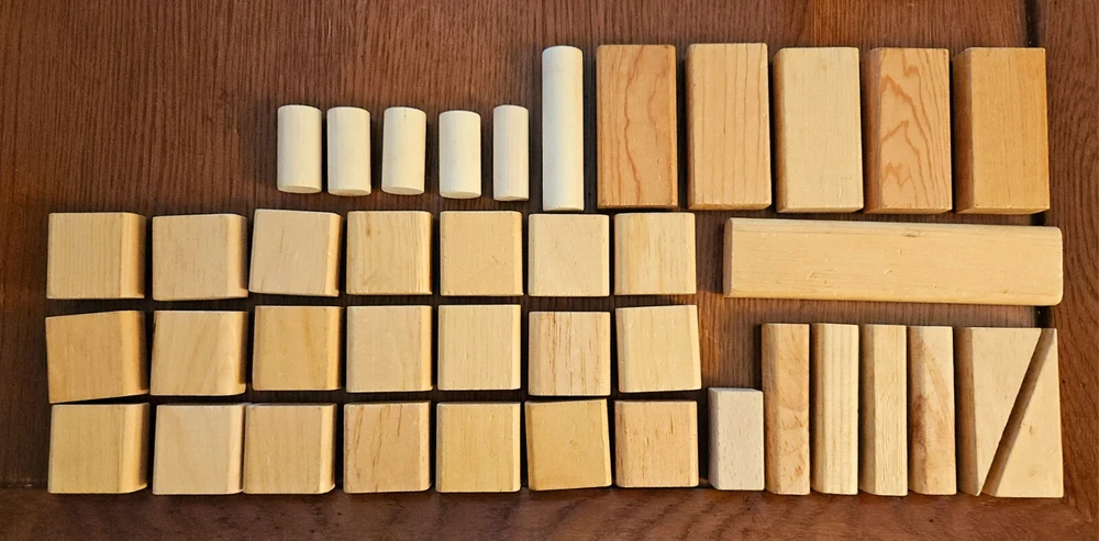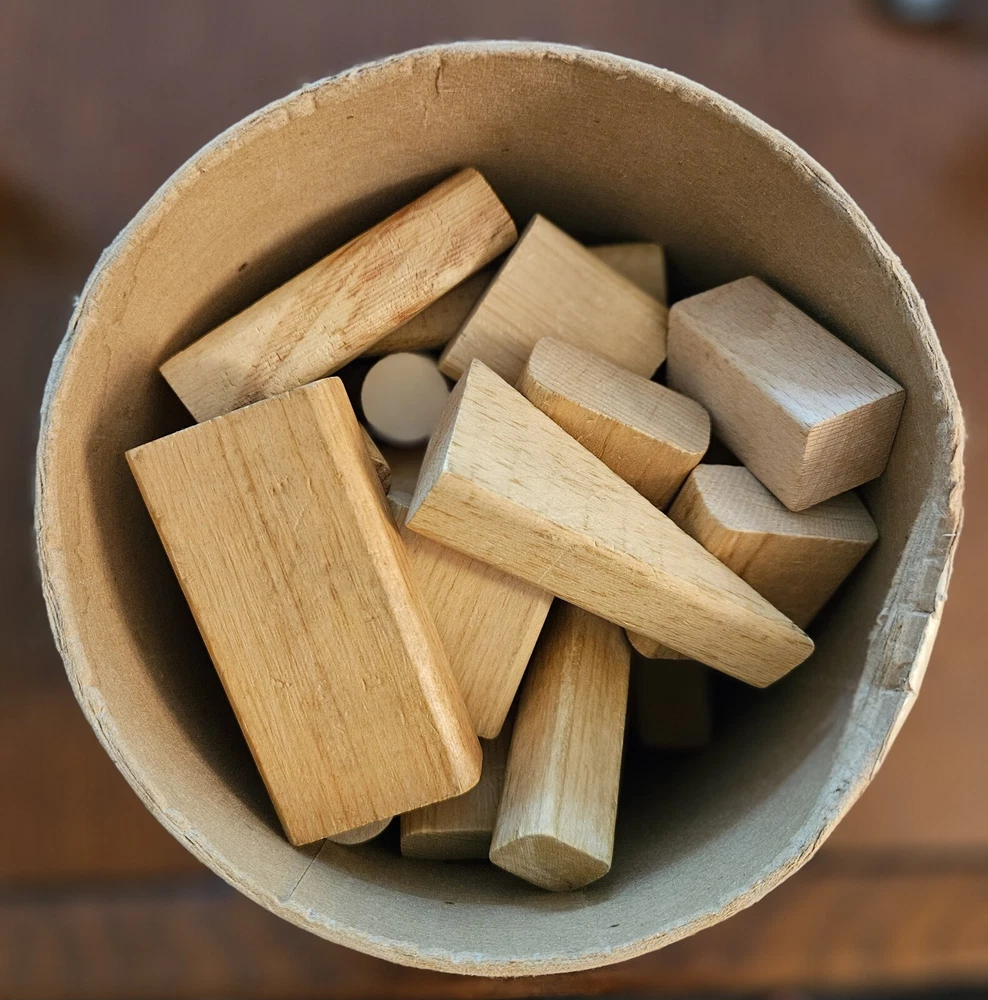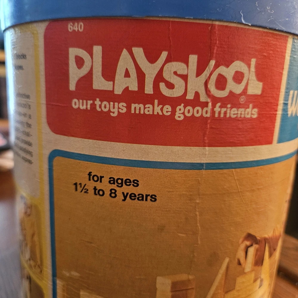 Original Vintage 1974 Playskool Natural Wood Blocks. 40 block set. Made in USA. Comes in original canister that still seals to hold blocks in. Recommended for ages 1.5 to 8 years.