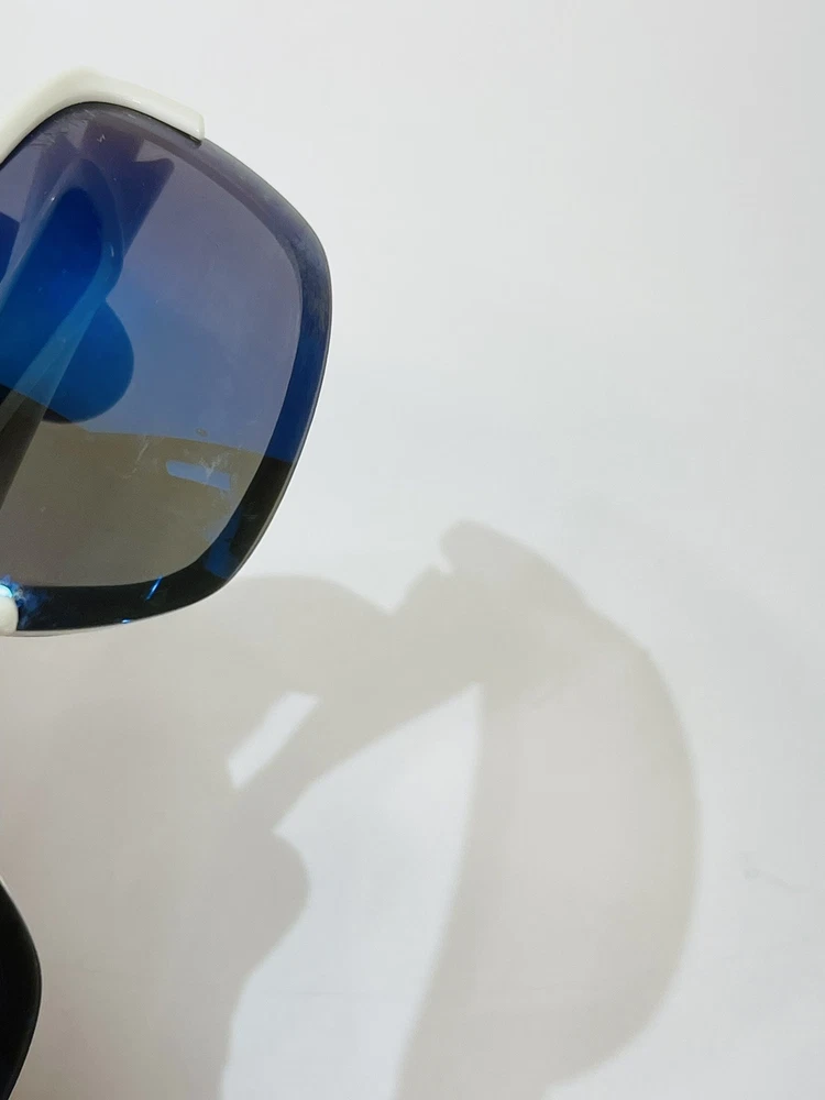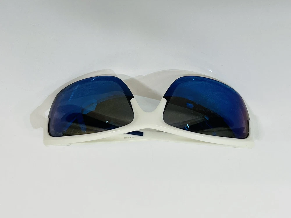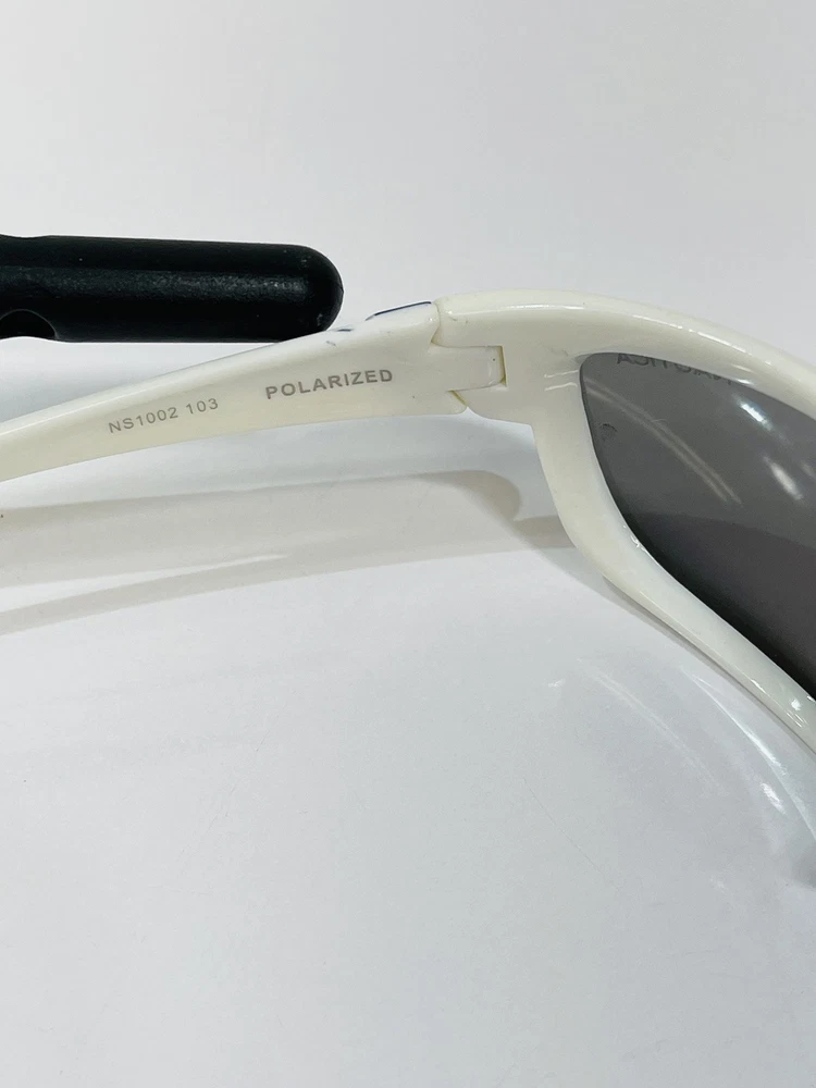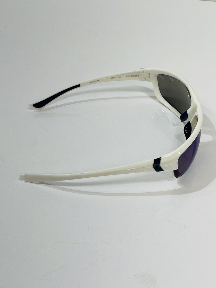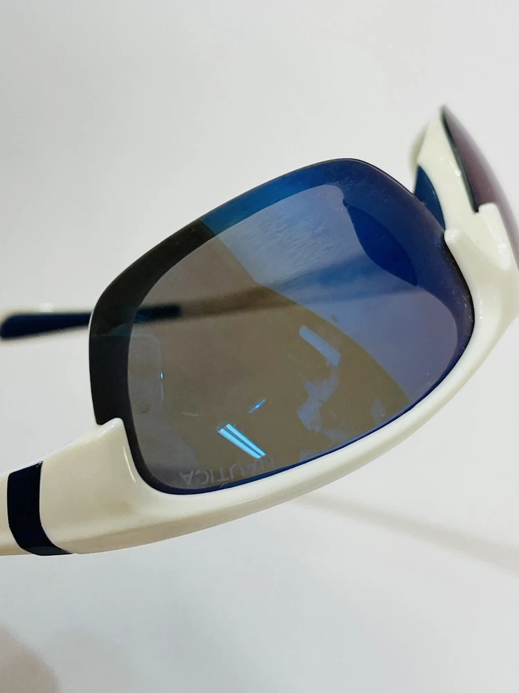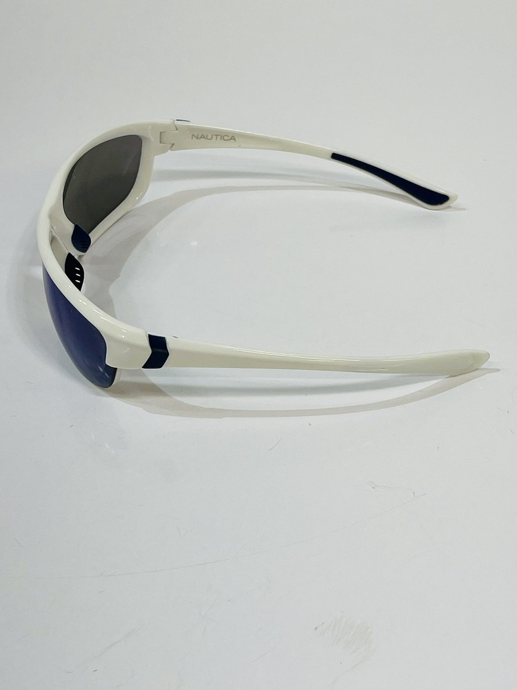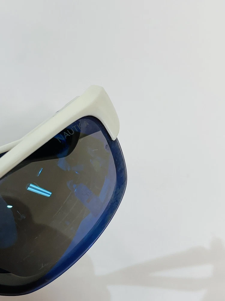 The Nautica polarized sunglasses are in good condition. There is some light scuffing and a scratch on the lenses and a mark on the white frame. Otherwise there are in usable condition.