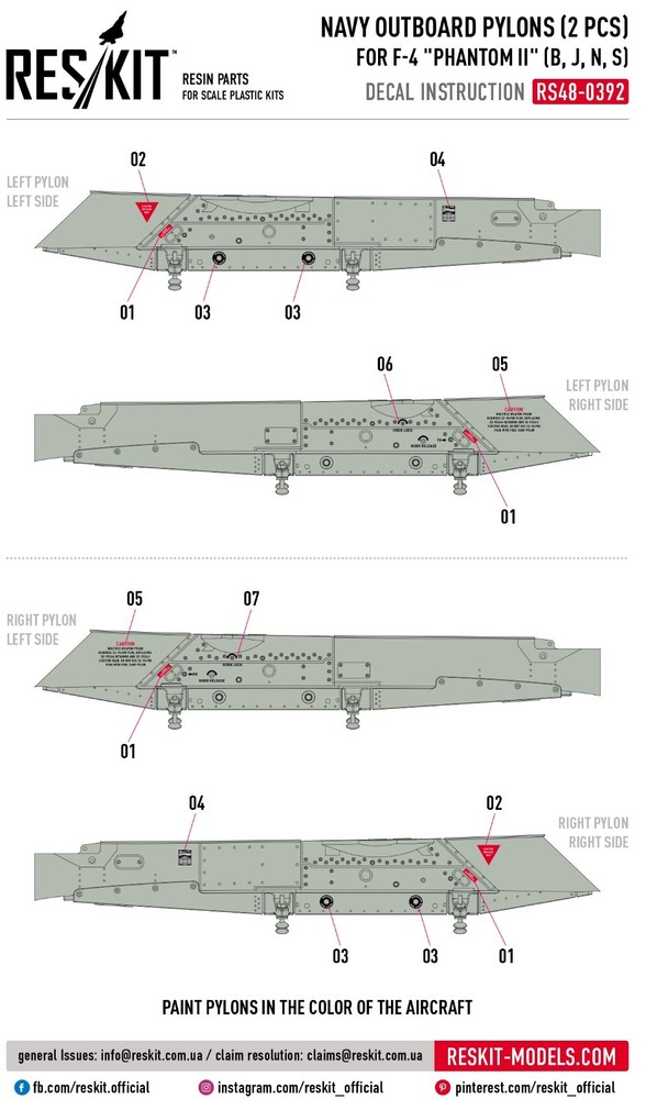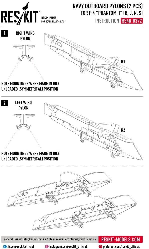 NAVY Outboard pylons for F-4 "Phantom II" (B,J,N,S) (2 pcs) (3D Printed) Scale 1:48 ResKit RS48-0392 - for Plastic Model Kit Scale: 1/48 Manufacturer: RESKIT (Accessories for Scale Plastic Kits) Country/Region of Manufacture : Ukraine Features: Kit Condition : New in Box Type of equipment : Aircraft Type of product: PYLONS / BOMB RACKS Recommended kit: Any Category: RESIN & 3D ACCESSORIES NAVY Outboard pylons for F-4 "Phantom II" (B,J,N,S) (2 pcs) NAVY, F-4B, F4B, F 4B, F-4J, F4J, F 4J, F-4N, F4N, F 4N, F 4S, F-4S, F4S, PHANTOM II for Scale Model Kit ---------------------------- If you have a desire to procure a GREATER NUMBER OF ITEMS THAN WHAT IS CURRENTLY DISPLAYED, kindly let us know, and we will happily modify our offerings to suit YOUR EXACT QUANTITY NEEDS. ---------------------------- >>> Visit our eBay store! <<< You will find everything you need at great prices. Reskit: The Ultimate Upgrade for Your Scale Models Reskit is the leading provider of upgrade sets for scale models, offering a wide range of products to enhance the realism and detail of your models. Our sets include everything from engines and interiors to exterior accessories and weapons. Whether you're a beginner or a seasoned modeler, Reskit has the upgrade sets you need to take your models to the next level. Here are just a few of the benefits of using Reskit upgrade sets: Increased realism and detail: Our sets are made with high-quality materials and components that will add a touch of authenticity to your models. Improved performance: Our sets can help improve the performance of your models, making them more realistic and engaging. Reskit upgrade sets are the perfect way to add realism, detail, and performance to your scale models. With our wide range of products, you can find the perfect upgrade set to transform your models into showpieces.