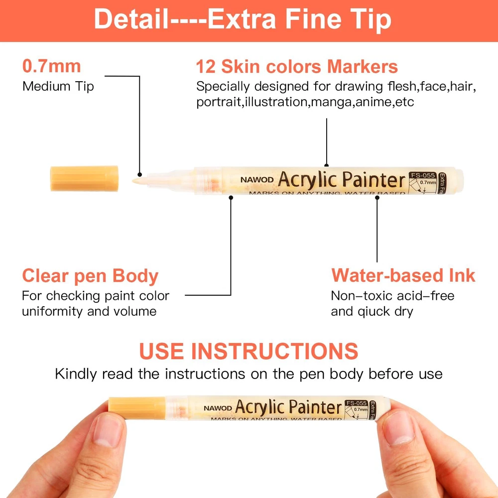 NAWOD Skin Tones Art Markers, Acrylic Paint Pens Set of 12 Skin Colors Paint ...