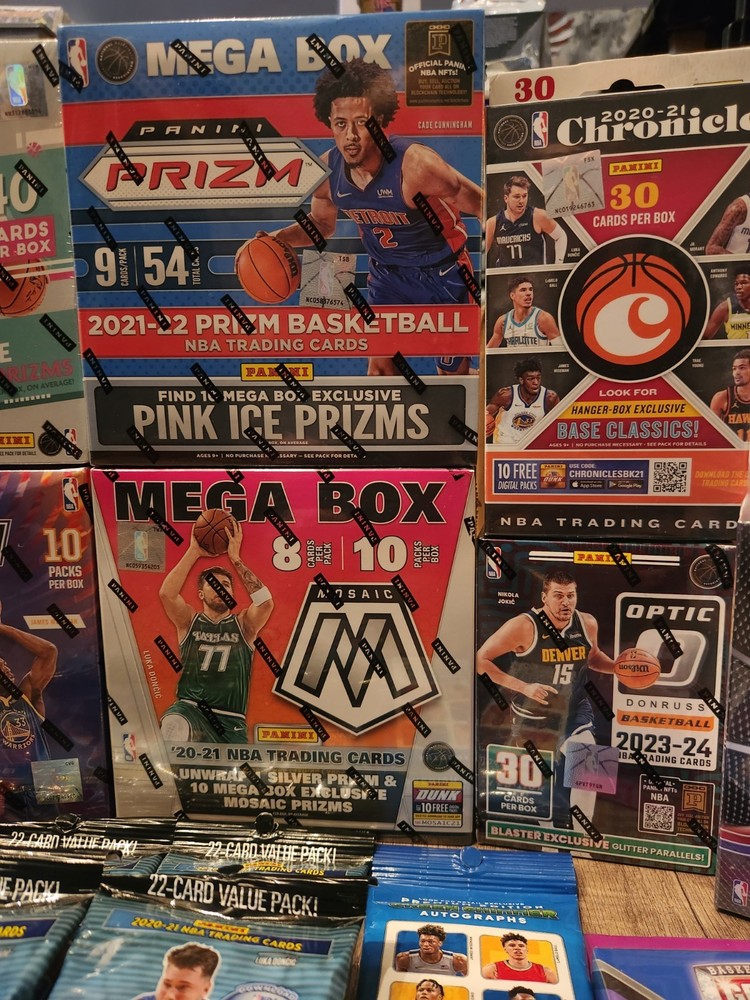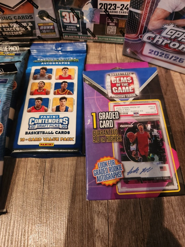Listing is for the pictured NBA Lot of factory sealed items. All have been stored in a climate controlled and smoke free environment. Been in my possession since initial release/purchase of each item. All factory sealed but may contain standard blemishes that occur from the time they leave the production line and are distributed at their final location. A couple items contain price sticker residue. *READ**: this lot contains multiple years from the 2020-21 season(Lamelo, Anthony Edwards, Haliburton, etc. rookie year) to the 2025-26 season(Cooper Flagg rookie year). Please view the pictures carefully to notate the years. In all, there are 4 mega boxes, 2 blaster boxes, 3 hanger boxes, 6 cello packs, and a "Gems of the Game" mystery box containing one graded card. Thank you for viewing my listing.