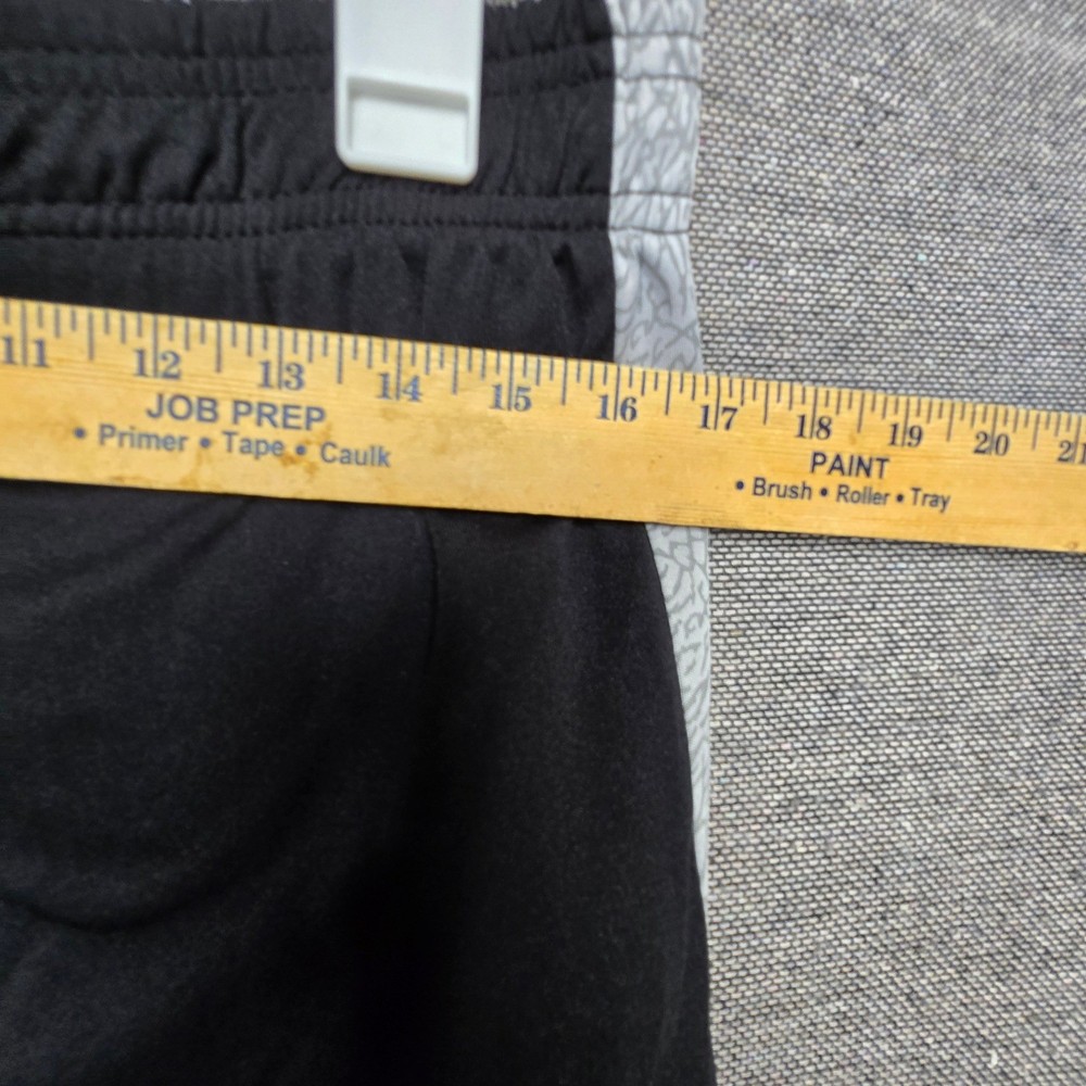 NBA athletic shorts combine performance and style with a lightweight 100% polyester construction. These black basketball shorts feature distinctive grey elephant print side panels and the iconic NBA logo embroidered on the lower left leg. Designed with an elastic waistband for a comfortable fit, they are perfect for on-court action or casual streetwear. Measurements: • Waist: 14" (28" doubled) • Inseam: 9" • Rise: 12" • Leg Opening: 11"
