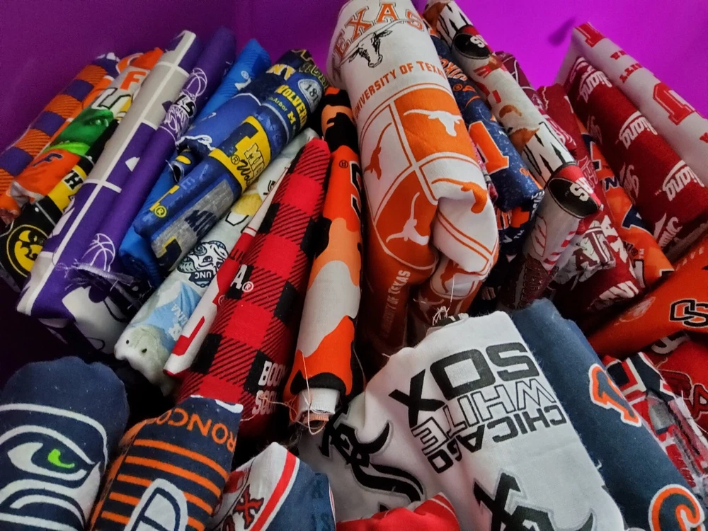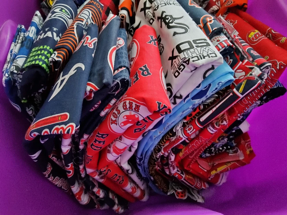 MLB NFL & NCAA Broadcloth/Cotton Fabric This is a huge lot of fabric available. I made cornhole bags for 15 years and have closed up my shop. I have all this fabric left over and have no use for it. Here's your chance to get many, many yards for a very small charge. There is probably 45 yards of fabric or so in this lot. May be a little more or a little less but 45 is close. That makes it about a 25 pound box so shipping is not cheap. Shipped by USPS ground advantage. 22 years of selling on Ebay with 100% positive feedback.