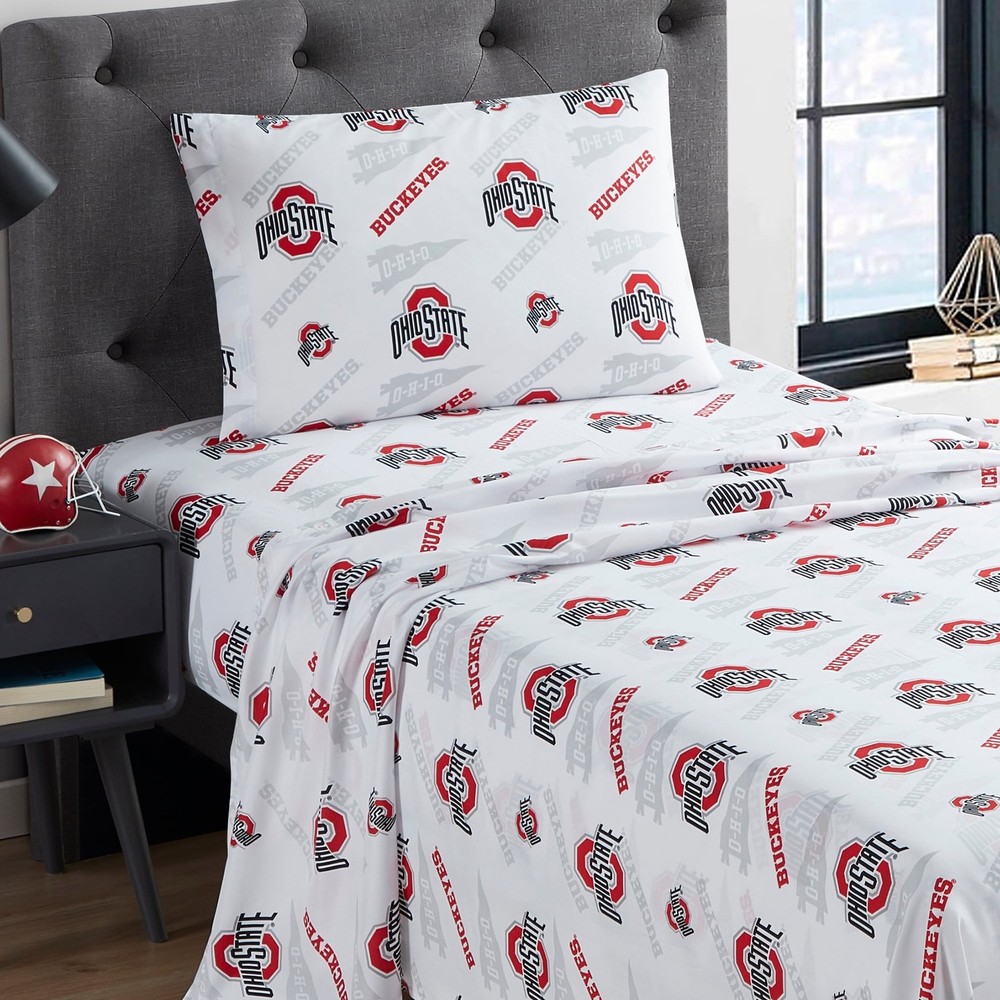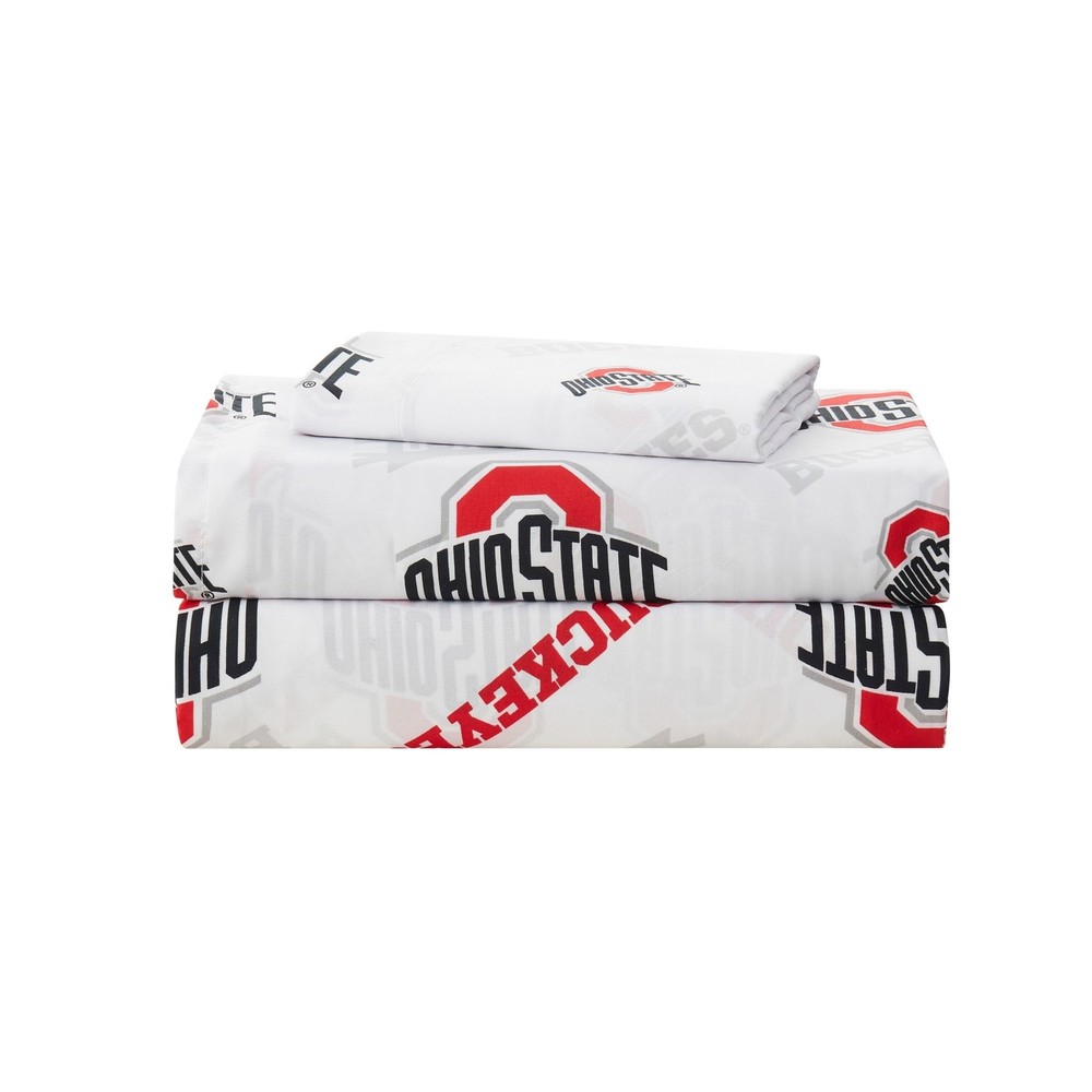 Show your team spirit with our Officially Licensed Ohio State Buckeyes NCAA Sheet Sets from Northwest. Made with ultra soft Polyester microfiber for the greatest comfort while you dream of your team's victory.The sheet set features a repeating Team Logo Design Officially Licensed NCAA Product Twin and Twin XL Sets includes 1 Fitted Sheet, 1 Flat Sheet and 1 Pillowcase Full, Queen Sets include 1 Fitted Sheet, 1 Flat Sheet and 2 Pillowcases. Machine washable Material:Polyester Microfiber 14" deep pocket Dimensions: Twin: Fitted 75" x 39", Flat 96" x 66", One Pillowcases 20" x 30"Twin XL: Fitted 80" x 39", Flat 101" x 66", One Pillowcases 20" x 30" Full: Fitted 75" x 54", Flat 96" x 81", Two Pillowcases 20" x 30" Queen: Fitted 80" x 60", Flat 102" x 90", Two Pillowcases 20" x 30" Free Shipping Over $49.99* Details NCAA Officially Licenced Ohio State Buckeyes Sheet Set Product Description: Show your team spirit with our Officially Licensed Ohio State Buckeyes NCAA Sheet Sets from Northwest. Made with ultra soft Polyester microfiber for the greatest comfort while you dream of your team's victory. The sheet set features a repeating Team Logo Design Officially Licensed NCAA Product Twin and Twin XL Sets includes 1 Fitted Sheet, 1 Flat Sheet and 1 Pillowcase Full, Queen Sets include 1 Fitted Sheet, 1 Flat Sheet and 2 Pillowcases. Machine washable Material:Polyester Microfiber 14" deep pocket Dimensions: TwinFitted 75" x 39", Flat 96" x 66", One Pillowcases 20" x 30" Twin XLFitted 80" x 39", Flat 101" x 66", One Pillowcases 20" x 30" FullFitted 75" x 54", Flat 96" x 81", Two Pillowcases 20" x 30" QueenFitted 80" x 60", Flat 102" x 90", Two Pillowcases 20" x 30"