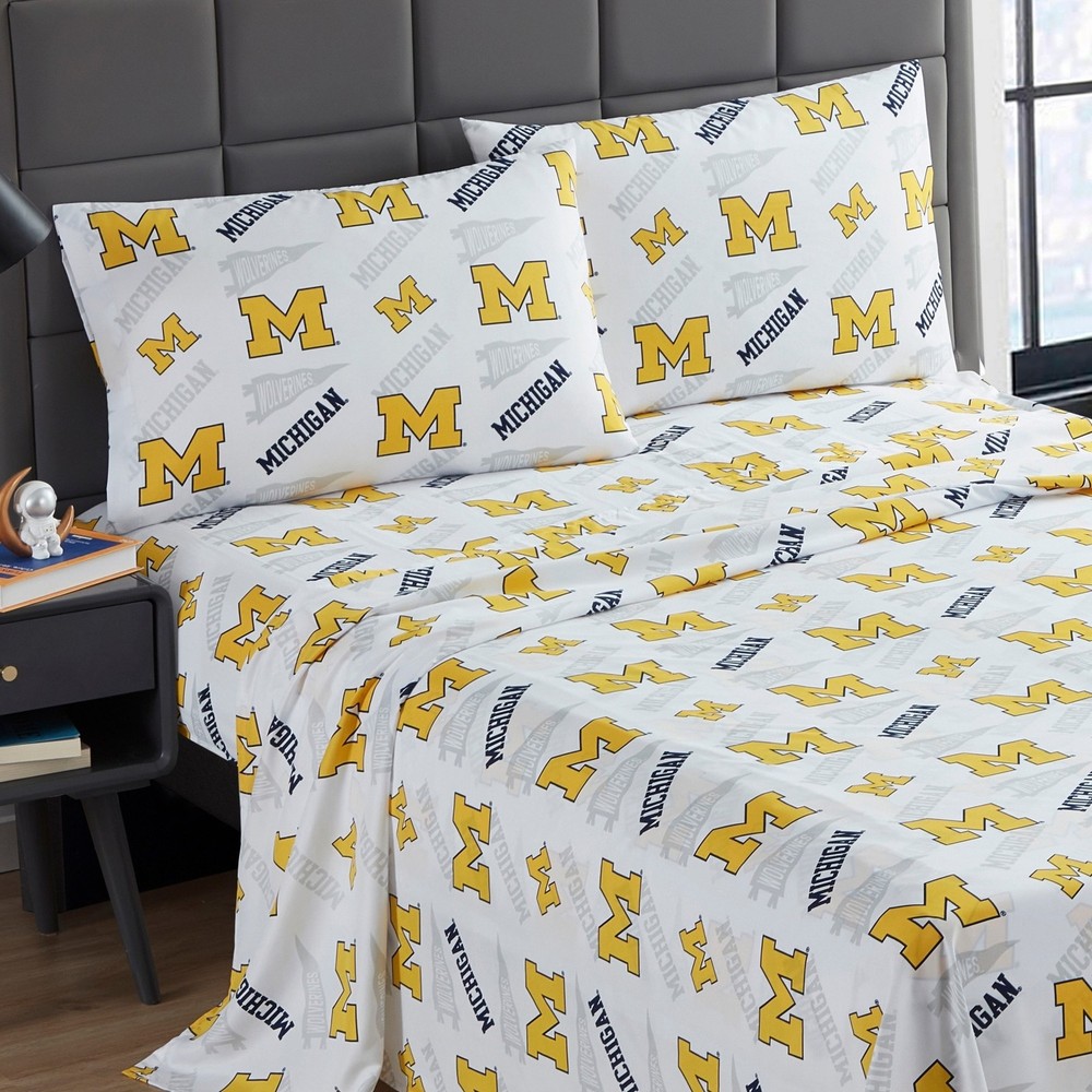 Show your team spirit with our Officially Licensed Michigan Wolverines NCAA Sheet Sets from Northwest. Made with ultra soft Polyester microfiber for the greatest comfort while you dream of your team's victory.The sheet set features a repeating Team Logo Design Officially Licensed NCAA Product Twin and Twin XL Sets includes 1 Fitted Sheet, 1 Flat Sheet and 1 Pillowcase Full, Queen Sets include 1 Fitted Sheet, 1 Flat Sheet and 2 Pillowcases. Machine washable Material:Polyester Microfiber 14" deep pocket Dimensions: Twin: Fitted 75" x 39", Flat 96" x 66", One Pillowcases 20" x 30"Twin XL: Fitted 80" x 39", Flat 101" x 66", One Pillowcases 20" x 30" Full: Fitted 75" x 54", Flat 96" x 81", Two Pillowcases 20" x 30" Queen: Fitted 80" x 60", Flat 102" x 90", Two Pillowcases 20" x 30" Free Shipping Over $49.99* Details NCAA Officially Licenced Michigan Wolverines Sheet Set Product Description: Show your team spirit with our Officially Licensed Michigan Wolverines NCAA Sheet Sets from Northwest. Made with ultra soft Polyester microfiber for the greatest comfort while you dream of your team's victory. The sheet set features a repeating Team Logo Design Officially Licensed NCAA Product Twin and Twin XL Sets includes 1 Fitted Sheet, 1 Flat Sheet and 1 Pillowcase Full, Queen Sets include 1 Fitted Sheet, 1 Flat Sheet and 2 Pillowcases. Machine washable Material:Polyester Microfiber 14" deep pocket Dimensions: TwinFitted 75" x 39", Flat 96" x 66", One Pillowcases 20" x 30" Twin XLFitted 80" x 39", Flat 101" x 66", One Pillowcases 20" x 30" FullFitted 75" x 54", Flat 96" x 81", Two Pillowcases 20" x 30" QueenFitted 80" x 60", Flat 102" x 90", Two Pillowcases 20" x 30"