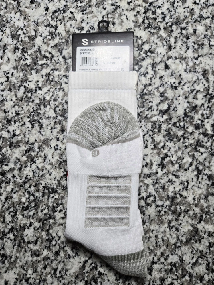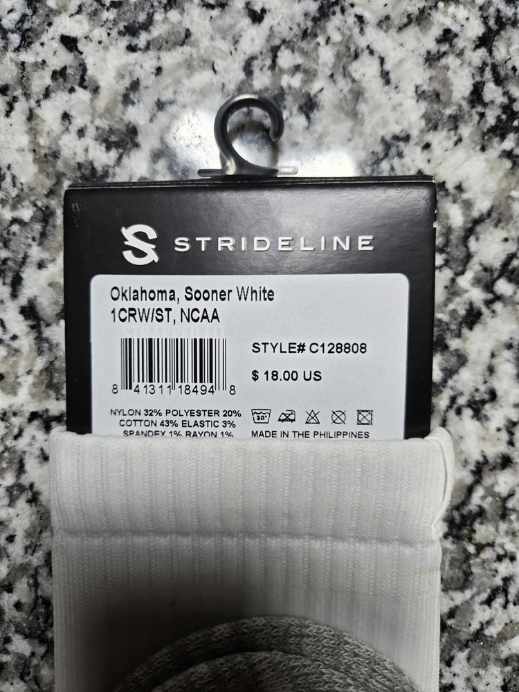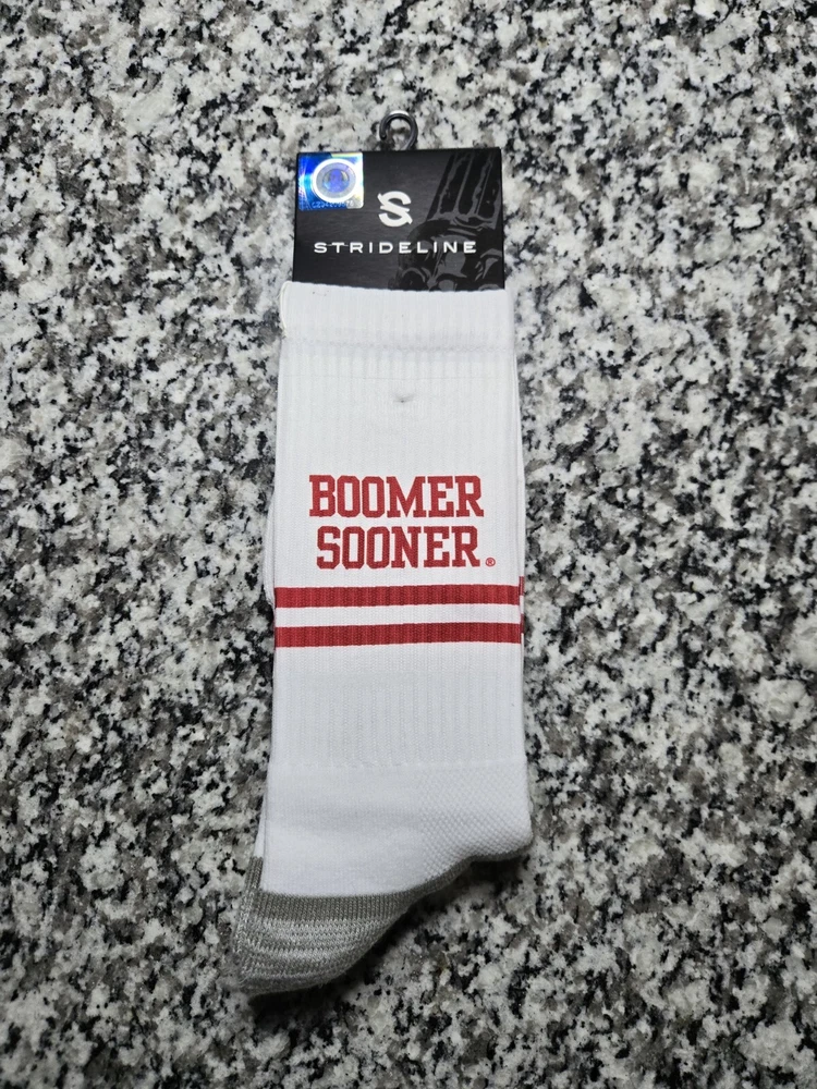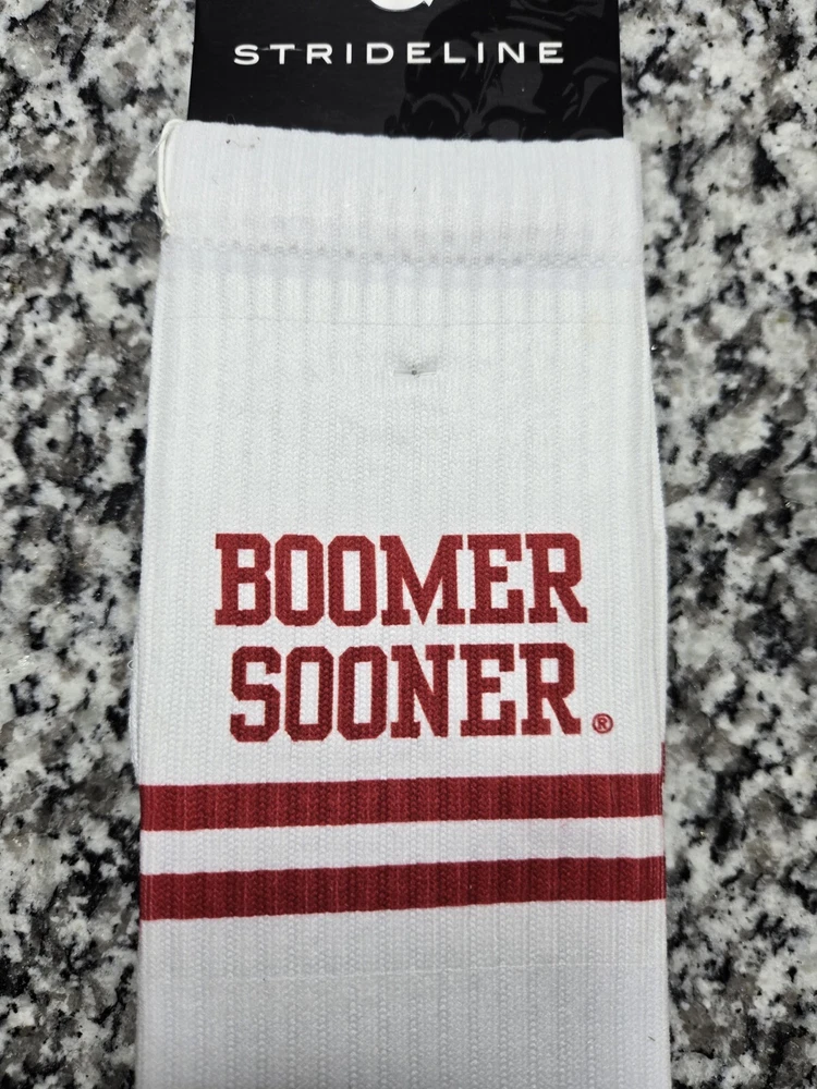 Show your team spirit with these NCAA Oklahoma Sooners socks. These white athletic crew socks are made for football fans who want to show their support. The socks feature the "OK Boomer" pattern and are size small-medium, perfect for men's size 8-12M. Made by Rock 'Em, these socks are designed to provide comfort and performance on the field. The socks are made in China and are of high quality. Don't miss out on the chance to show your team spirit with these college football socks.