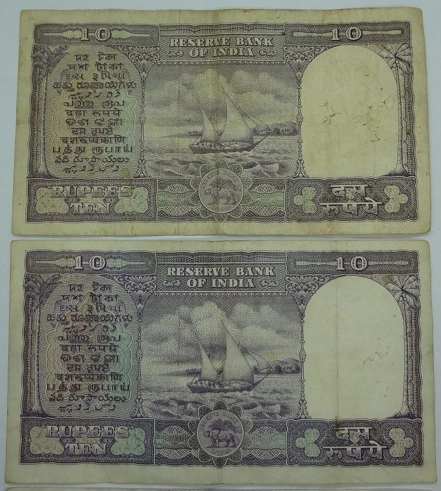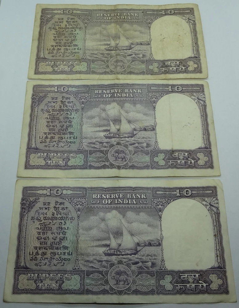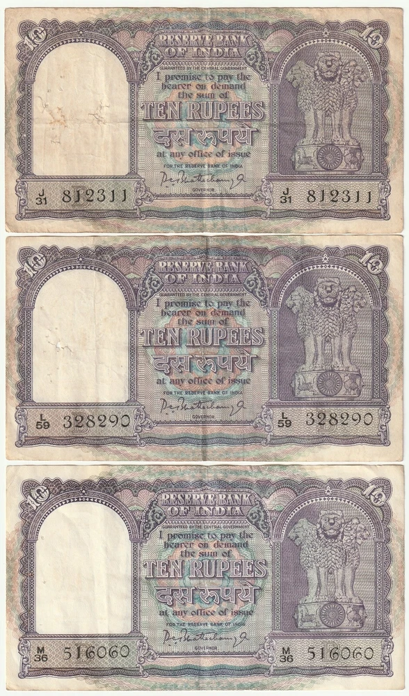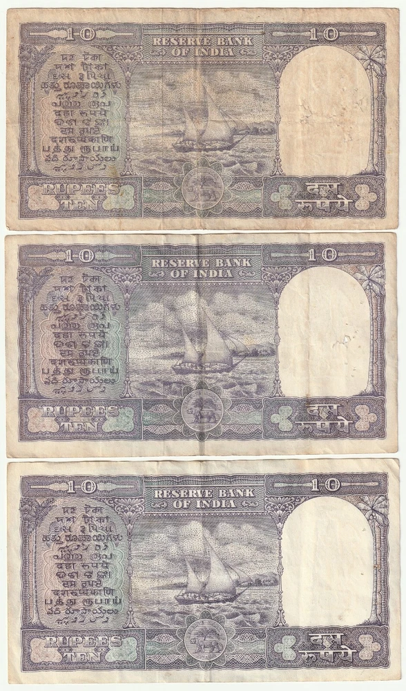 ND (1962-67) INDIA Lot of 3 Notes 10 RUPEES Letter B, Signature # 75 Pick # 40b Circulated Please grade and judge based on what you see in the pictures and bid accordingly Pictures and/or Scans are for Actual Item PAYMENT Please note that I use The New eBay's Unpaid Assistant System, and Unpaid Item Case is automatically opened on the 4th day from the end of the auction. If you need more time, please let me know so that I opt you out from the system SHIPPING Packages will be shipped within 24 Hours (Monday through Friday) after receiving a clear payment (No shipping on Saturdays, Sundays & National Holidays) Combined Shipping & Handling Fees Invoices will be combined for items won within 4 days only, since Payment is expected within this time frame. Again, if you need more time, please let me know Single Coins (Combined S/H): Highest full rate for the first coin plus $0.50 for each additional coin won Sets, Lots, Boxed/Cased Coins: Highest full rate plus 50% of S/H fees listed per extra item won Feedback & Communications Feedback will be posted automatically If any problem arises, please email me and I'll make every effort to resolve it If you have any question, please do not hesitate to email me GOOD LUCK