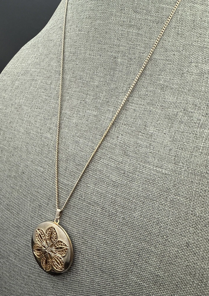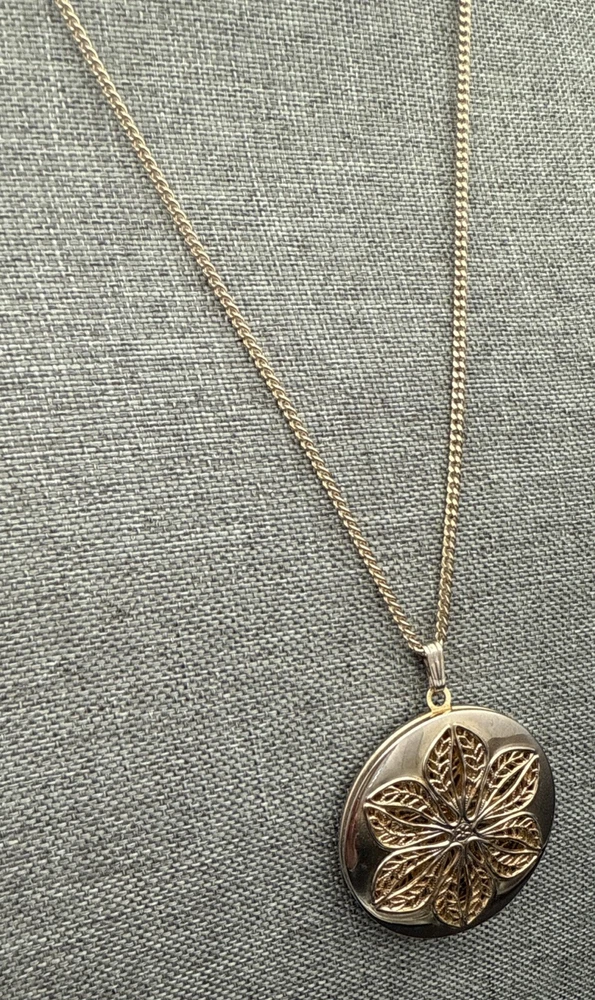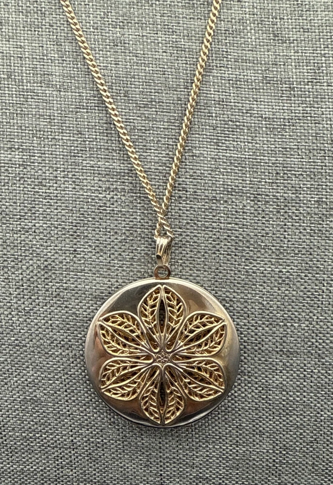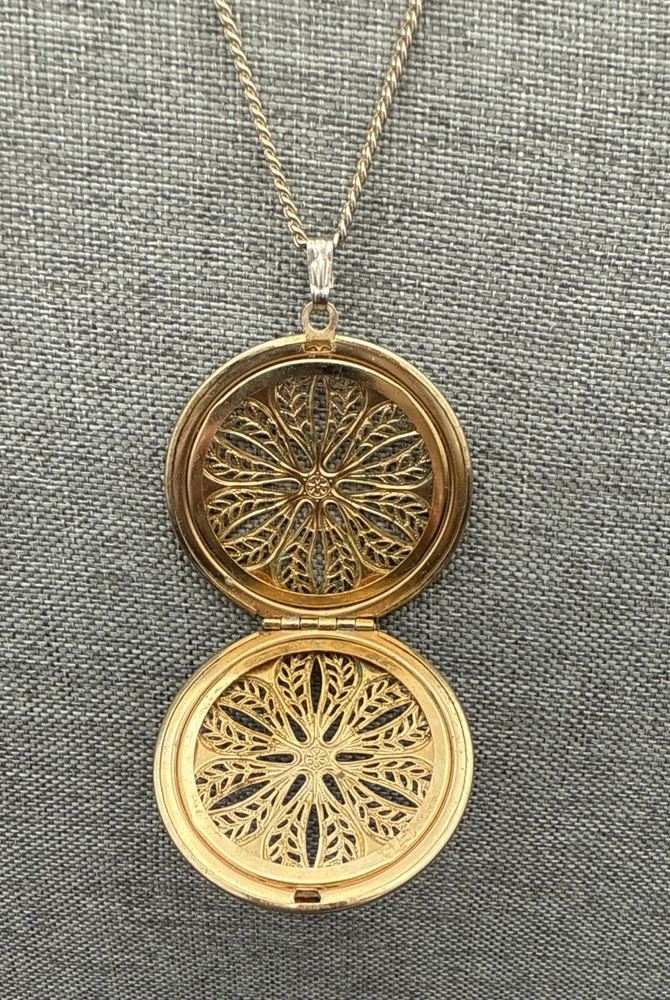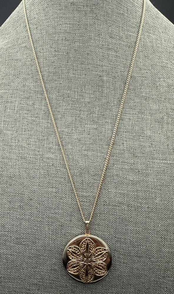 NECKLACE Gold Tone Chain Decorative Round Filigree Pendant Opens/Closes 24 Inches. See Photos (5551)