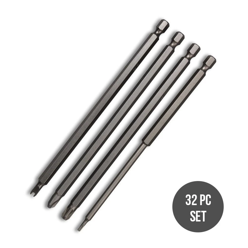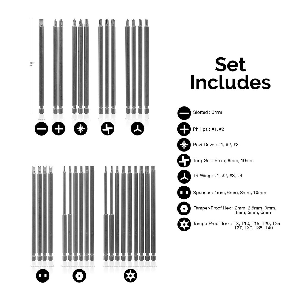 HIGH-QUALITY HEX-BIT SET: Each screwdriver bit set piece in this set is made from durable S2 alloy steel, which reduces wear and tear and ensures longevity. This bit kit contains uncommon bits that will loosen tamperproof bits that regular screwdrivers can’t unscrew. VERSATILE TAMPERPROOF BIT SET: This versatile bit-driver set includes 8 unique bit ends, including slotted, Phillips, Pozidriv, Torq-Set, Tri-Wing, spanner, tamperproof hex, and tamperproof Torx. PRECISION MACHINED BITS: Each piece in this screw bit set is an extra-long bit set is finely crafted and precisely machined for accurate size. The chamfered bit ends insert smoothly into fasteners and protect both the bits and the fasteners from damaged edges. 1/4-INCH HEX SHANK: Each security power bit in this hex drill-bit set measures 6" long and has a universal 1/4-inch hex shank. These bits are ideal for working with electronic appliances. Use this set wherever extra security is a must. HEAVY-DUTY SECURITY BITS: Our security bit set can be used for any project, large or small. Use the bits to secure corresponding screws into wood, metal, or any material when extra security is needed. Get work done with confidence and speed!