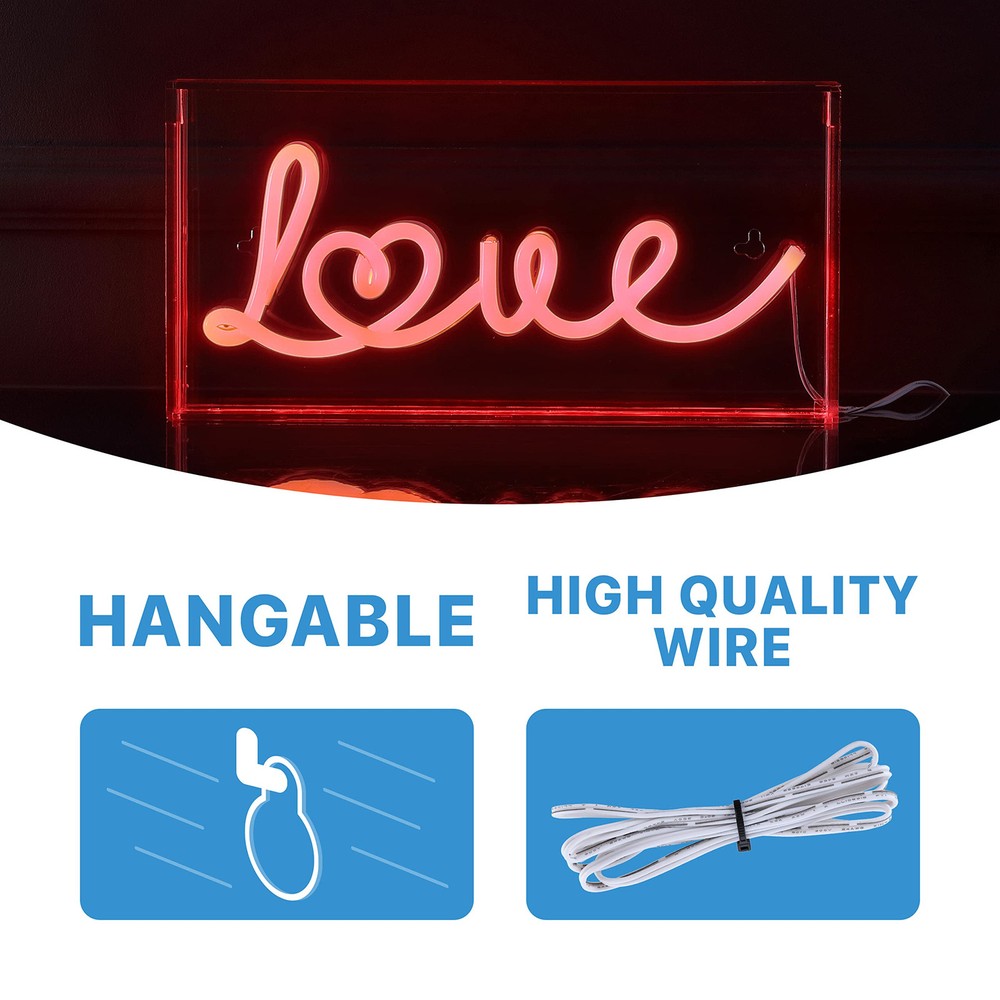 Bright neon makes a whimsical addition to your bookshelf or gallery wall. Place our hearted Love sign in your bedroom to tune up the romantic ambiance. Convenient, low-voltage USB power is perfect for a bedroom or dorm room. STYLISH & PRACTICAL DESIGN: Neon Lights are designed with quality care; Let everyone know your selected message that's glazing in your dimly lit space, whether it's to invite them in or instigate lively vibes EASY TO INSTALL: Integrated USB cable, this neon light can be inserted into a USB port; This neon light has options for installing - it can be placed on any level of flat surface or hung on a wall; Pre-made holes allow easy inserts for wall mounting SATISFACTION GUARANTEED: Every design is created with uncompromising attention to detail, using only the highest quality components; Based in Soho, New York, designer Jonathan and his talented team create affordable high-end home decor Acrylic box frame has nail slots for hanging; plus it stands by itself on a shelf or table Includes cable for safe, energy-efficient USB power - use a wall outlet or battery pack