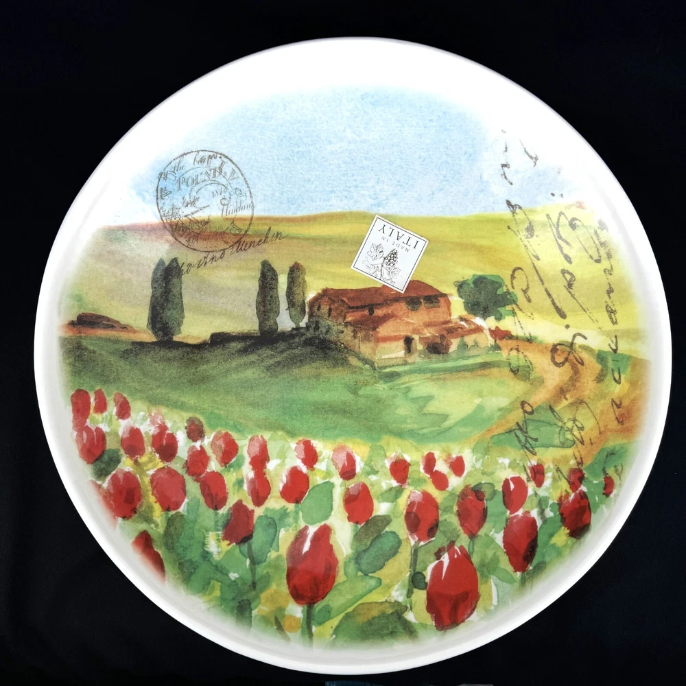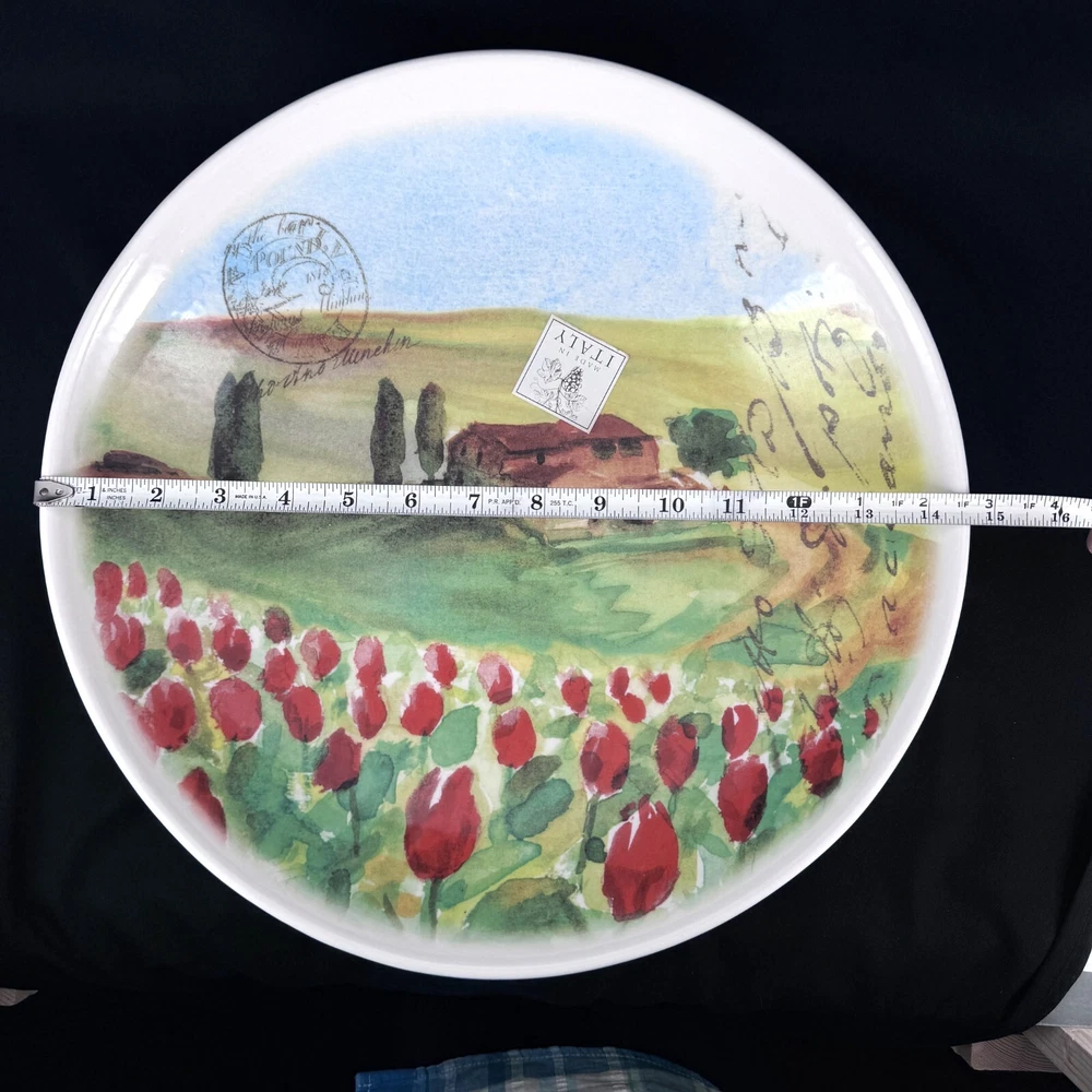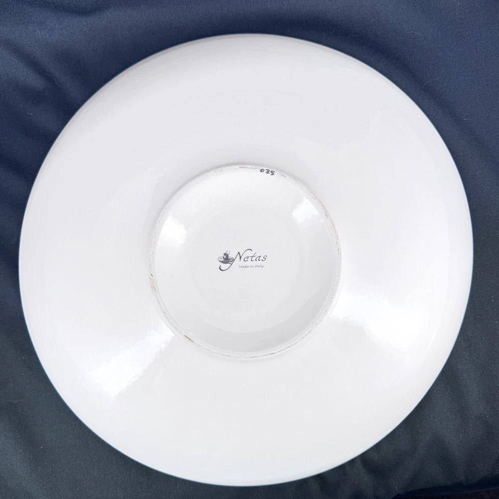 Netas large salad/serving bowl with hand painted Tuscany Italy countryside scene with red flowers and writing embellishments. Can't tell if the writing is the designer's signature. It is 14 1/2" diameter and stands 2 3/4" high. Excellent condition with no cracks, chips or crazing. Still has the original label "Made in Italy". There are a few small white specks that are bumps in the glaze and are not chips, as shown in the close-up photos. Please view the photos for details and condition. Measurements and photo colors are approximate. Shipping is USPS Ground Advantage at the rate determined by eBay. Follow your item's delivery progress with the USPS website Tracking Tool. Terms of Sale: Photos are of the actual item you will receive and sold "as is". Placing an order is your agreement that you know what you are buying, have viewed the photos and find the condition acceptable. Use eBay Messages to contact me for questions or concerns about your order. Please inspect your items upon arrival and contact me if there are any problems. Free returns within 30 days after delivery.