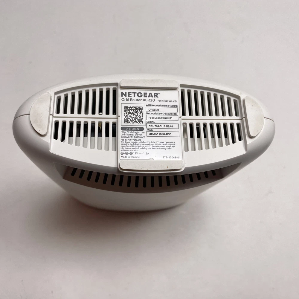 Seller Notes:“In good working condition. Photos show the actual items you will receive.”Maximum LAN Data Rate:1000 MbpsNumber of LAN Ports:1Model:Orbi Router RBR20Brand:NETGEARPorts:Ethernet (RJ-45)Color:WhiteConnectivity:Wired-Ethernet (RJ-45), Wireless-Wi-Fi 802.11a, Wireless-Wi-Fi 802.11ac, Wireless-Wi-Fi 802.11b, Wireless-Wi-Fi 802.11g, Wireless, Wireless (Wi-Fi)Maximum Wireless Data Rate:2200 MbpsType:RouterUPC:Does not applygtin13:Does not applyFeatures:Tri-Band