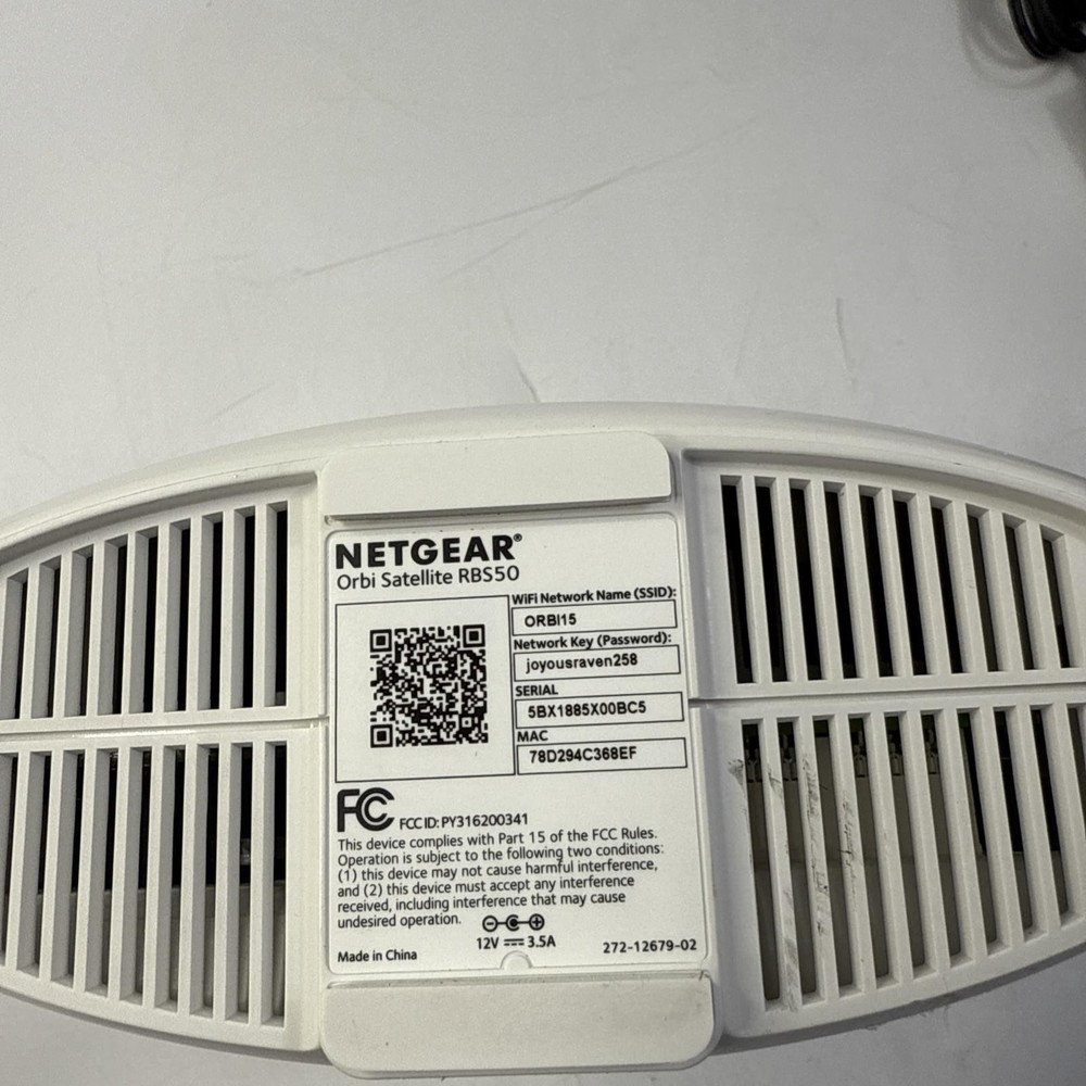 The NETGEAR Orbi RBS50 Satellite is a tri-band AC3000 WiFi extender in white color. With a maximum wireless data rate of 3000 Mbps and four LAN ports, it offers fast and reliable connectivity. The extender features Beamforming technology, VPN capabilities, and tri-band support, making it ideal for expanding and enhancing your home network. The model is RBS50 and it includes various connectivity options such as wireless Wi-Fi 802.11a/b/n/ac/g and wired Ethernet (RJ-45) ports. Listing and template services provided by inkFrog