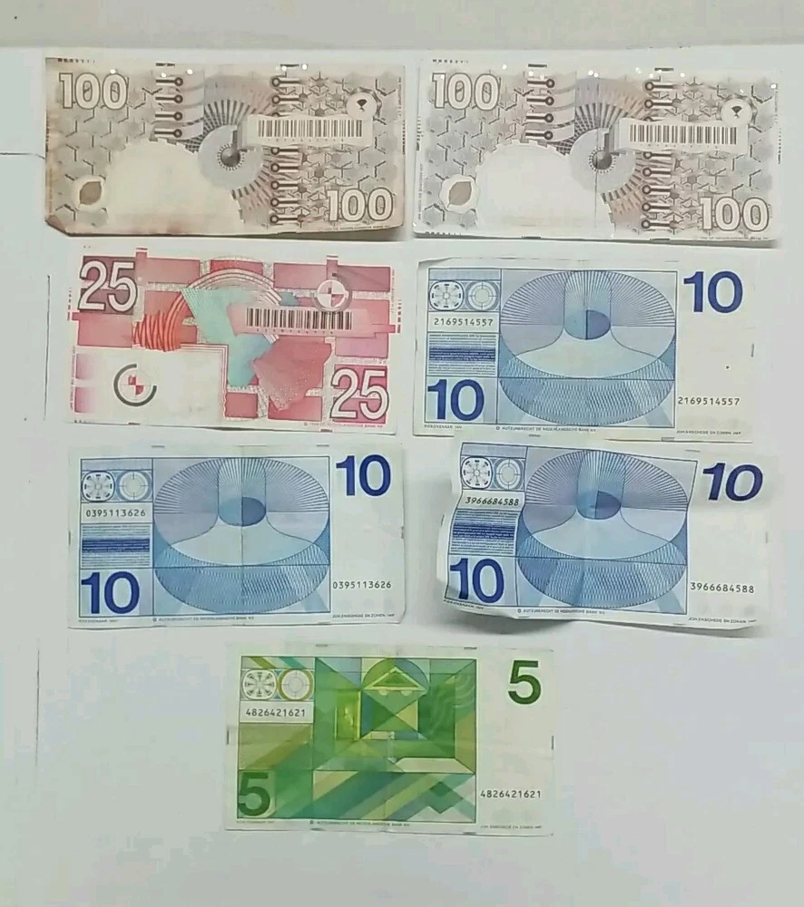 This lot consists of 7 circulated Dutch Guilder banknotes, totaling $260 in value. These notes are from the Netherlands and are still exchangeable. The collection includes various denominations of Dutch Gulden notes, providing a piece of Dutch currency history for collectors or those interested in foreign currency.
