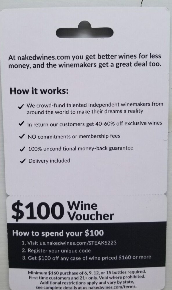 NEW! $100 WINE VOUCHER FOR NAKEDWINES Please read directions in pictures. Thank you! You will receive everything you see in the pictures. If you are not sure about anything, or have any special requests, please feel free to reach out to me anytime before buying or bidding. I package everything extremely well, but if you are purchasing something that is highly breakable, please consider Priority Mail or UPS which insure their packages for no additional charge. In the unlikely event you have a negative experience, please communicate it with me before leaving feedback, so we can make it right. Thank you for your interest!