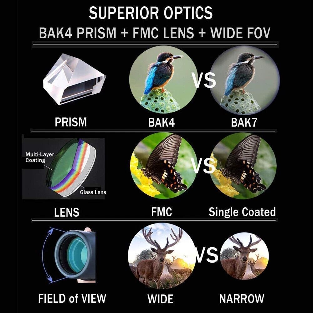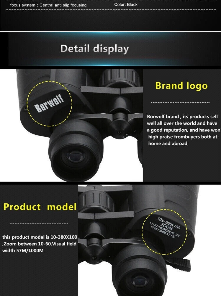 Introduction Magnification: 10-180x Objective Lens Diameter: 50mm (Broadband green or blue mode) Eyepiece Diameter: 17mm Field of view: 235FT/1000YDS; 78M/1000M Advantage: Waterproof: Lens barrel filling the high-purity nitrogen, waterproof and mouldproof, will not be affected by daily use in the rain or with damp. The internal and external material: Metal lens barrel, rubber outsourcing, exquisite and comfortable feeling, elegant appearance, fine workmanship, convenient to use Focusing type: Central Axial plus right eyepiece fine-tuning, can focus focal distance Coating: Several layers of vacuum high light transmittance green film, powerful light transmittance performance and high definition Application: bird appreciation, watching sports game or the concert, outdoor travelling, enjoying the prospect etc Telescope Maintenance Method: After purchasing a telescope, you must pay attention when using it: Its storage place must be dry, since the film is easy to fall off and the prisma may be fogging or mouldy fter long-term becoming damp. When using, if it is found that there is some dirt or traces on the lens, DO NOT swab with water! The best way is to use swab at home (cotton swab) and dip it in some alcohol or gasoline, wipe gently. Better not to use lens wiping cloth to dry clean, it is easy to scratch the lens surface. Note: This binoculars are light enhancing or glimmering Night Vision,it will not work in full dark environment. Product Size: 190*185*55mm Package includes: 1Pc x Telescope 1Pc x Telescope Bag 1Pc x Strap(Length is about 93cm) 1Pc x Lens Cleaning Cloth(9.5*9.5cm) 2Pc x Lens Cap 2Pc x Eyepiece Cap 1Pc x User Manual