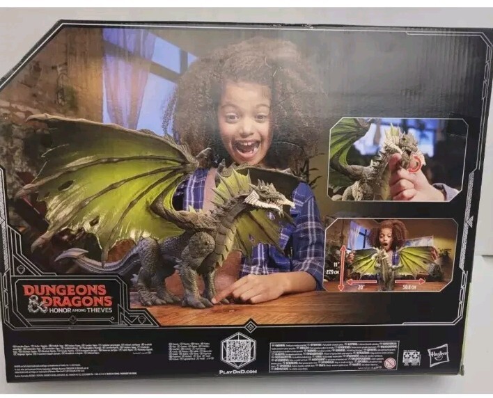 The product is a NEW Dungeons & Dragons Honor Among Thieves BIG RAKOR 20" Black Dragon action figure released in 2023 by Hasbro. The figure represents a dragon character from the Dungeons & Dragons franchise, measuring 20 inches in height. It is a multicolor figure and part of the TV, Movie & Video Games theme. The item is an original creation manufactured in China.