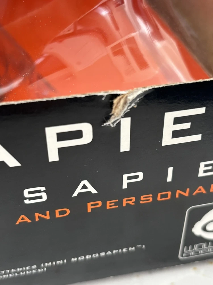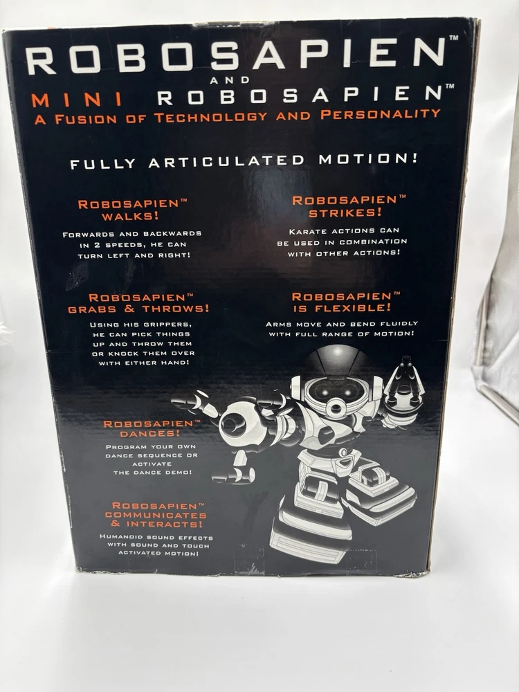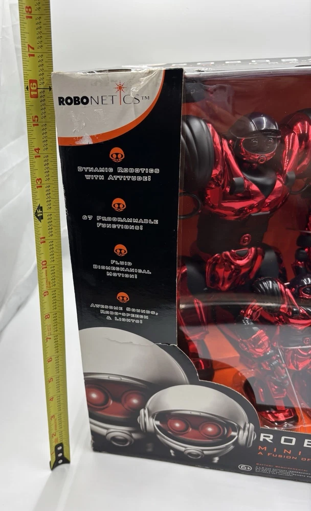 Vintage 2005 WowWee Robonetics Robosapien & Mini Combo Set This is a rare, limited-edition Metallic Red Chrome collector's set featuring both the original 14-inch Robosapien and its 7-inch Mini counterpart. A perfect "fusion of technology and personality" from the golden age of consumer robotics. Key Features: Full-Size Robosapien (14"): Fully programmable with 67 functions including walking, dancing, and "karate" moves. Features fluid biomorphic motion. Mini Robosapien (7"): Battery-operated walking action with light-up eyes and poseable arms. Rare Finish: Highly reflective metallic red chrome—much harder to find than the standard white/black versions. What's Included: Full-size Robot, Mini Robot, Remote Control, and Original Packaging. Condition Note: New in box. Minor shelf wear some small tears see photos. Remains factory sealed. Please see high-resolution photos for exact details.