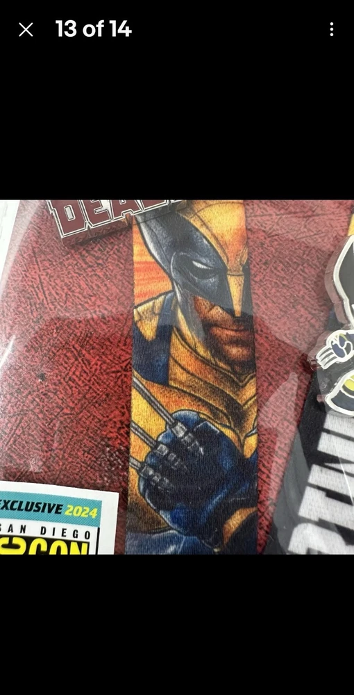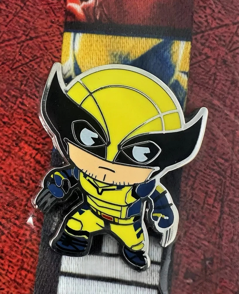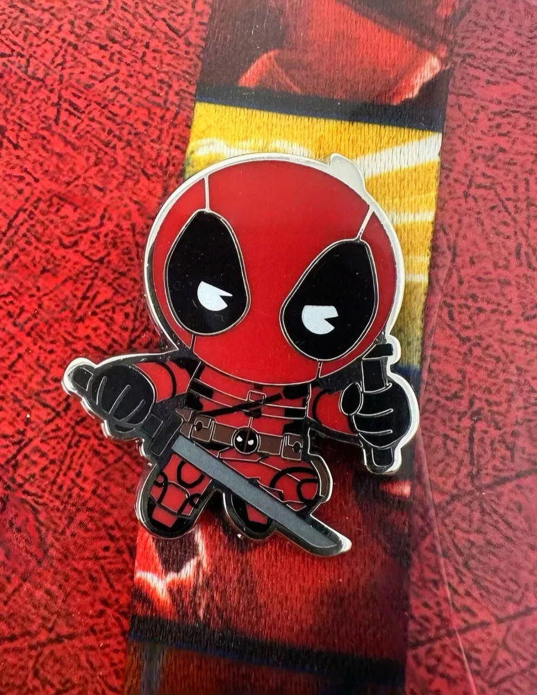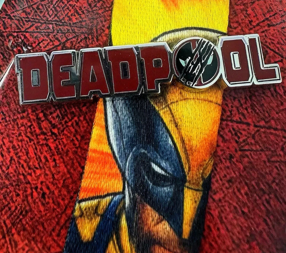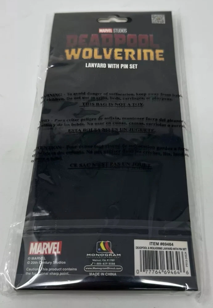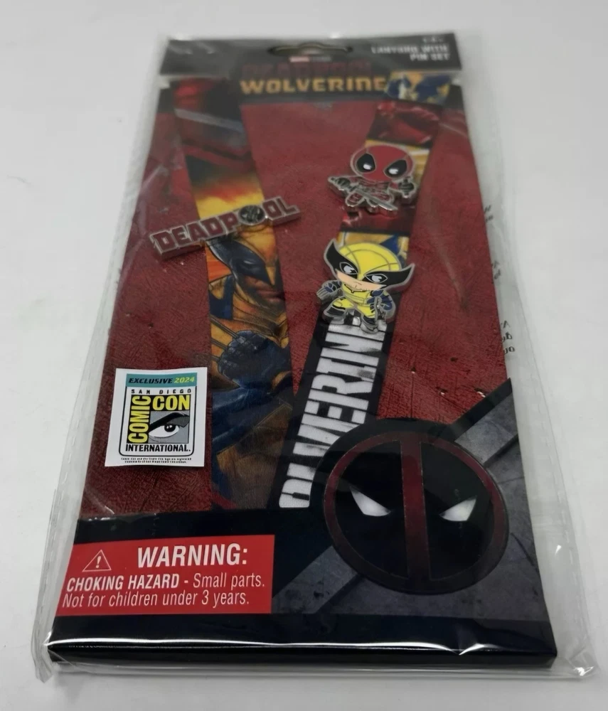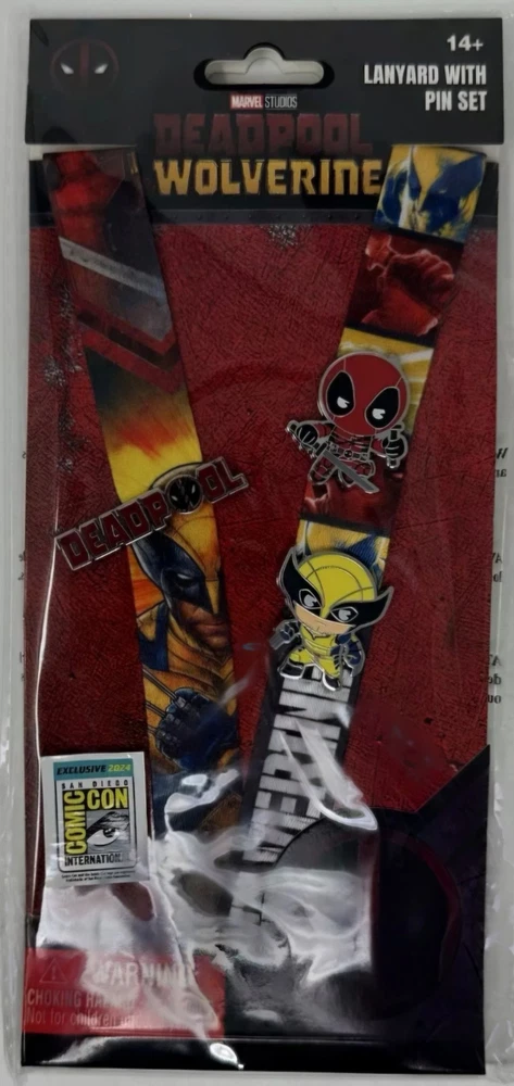 The product is a new 2024 San Diego Comic Con exclusive lanyard and pin set featuring Marvel Studios' Deadpool and Wolverine characters. The set is part of the Marvel Cinematic Universe and is branded as SDCC 2024 Marvel Studios. The theme revolves around comic book heroes, Deadpool and Wolverine.