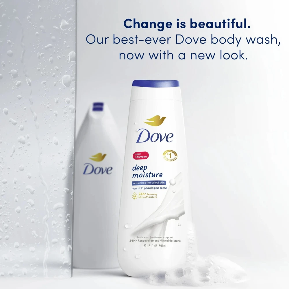 OUR ITEM SHIPPED FROM US WAREHOUSE Product details Just as everyone's skin is different, skin dryness can appear differently for everyone. From mild, occasionally dry skin driven by ageing, weather fluctuations or just life! To dry patches and skin dryness . No matter how dry your skin may look or feel, Dove has got you covered. Dove Deep Moisture body wash transforms even the driest skin in just one shower leaving you with softer smoother skin. Why it works: Specially formulated to transform even the driest skin, this body wash for dry skin is made with naturally-derived cleansers and plant-based moisturizers . Its moisturizing formula is infused with Microbiome Nutrient Serum, a unique blend of prebiotics that nourishes your skin and its microbiome – your skin's living protective layer – and helps build and strengthen its natural moisture barrier. By helping to moisturize skin, this hydrating body wash not only makes your skin feel instantly softer, it also helps to nurture your skin for long-lasting nourishment. Benefits: Dove cares for all. 24HR RENEWING MICROMOISTURE: Dove Deep Moisture Body Wash gently cleanses and deeply moisturizes the skin, leaving it renewed and healthy-looking for 24 hours FOR SOFT, SMOOTH SKIN: Our deeply moisturizing body wash, formulated with millions of MicroMoisture droplets, leaves skin soft as silk NOURISHES THE DRIEST SKIN: Dove Deep Moisture Body Wash for dry skin actively regenerates skin’s natural moisture and deeply nourishes the driest skin, leaving it soft and hydrated HOW TO USE: Squeeze a generous amount of Dove Deep Moisture Body Wash into your palms. Massage the moisturizing body wash onto your skin, taking a moment to enjoy the rich lather before rinsing off #1 DERMATOLOGIST-RECOMMENDED BODY WASH BRAND: From the #1 dermatologist-recommended body wash brand, this body wash, made with plant-based moisturizers, gently cleanses your skin and nourishes its microbiome THOUGHTFULLY MADE: This sulfate-free body wash is vegan and Dove is PETA approved, meaning we do not test on animals, anywhere in the world. Our body wash is packaged in 100% recycled plastic bottles, so you can feel good about switching to Dove 20 oz Dove Body Wash At a glance Brand Dove Weight 2.22 lb Count 1 Form Liquid Body wash & shower gel type Body Wash Features Daily Use, Softening,