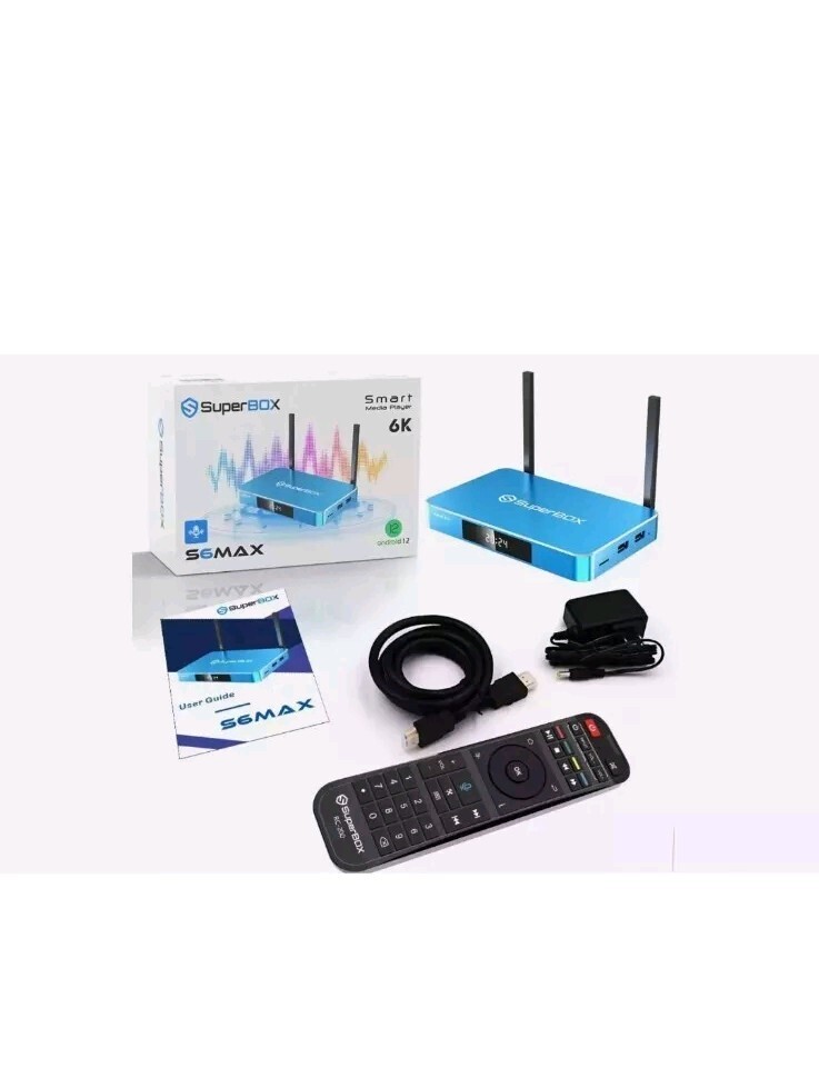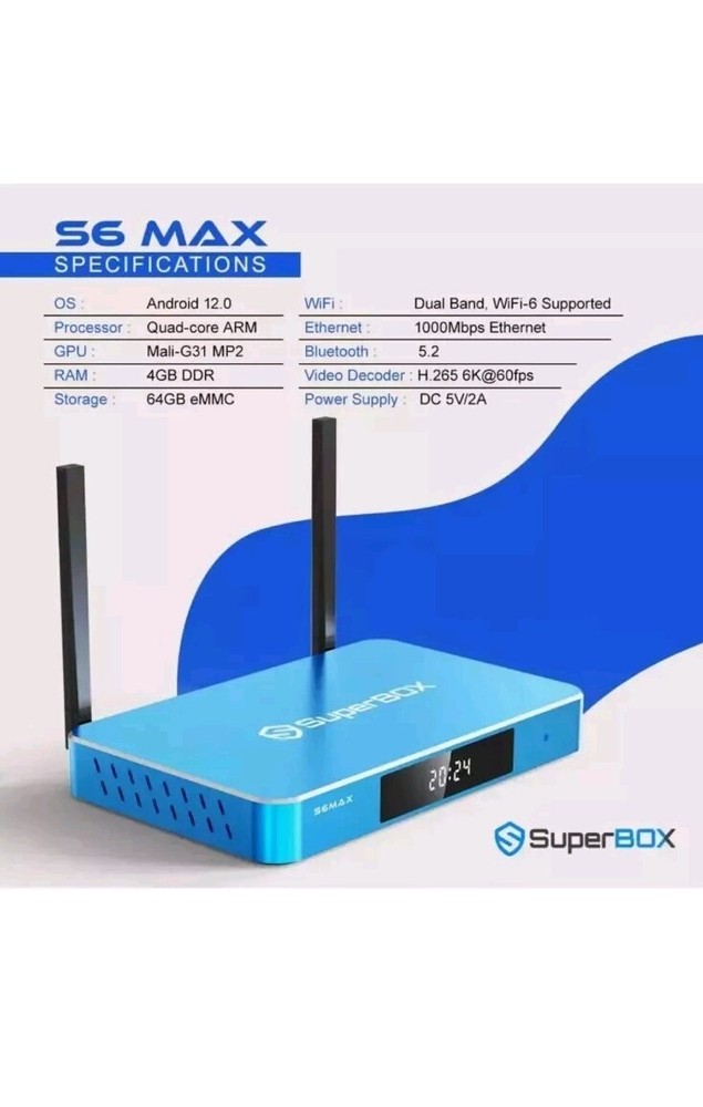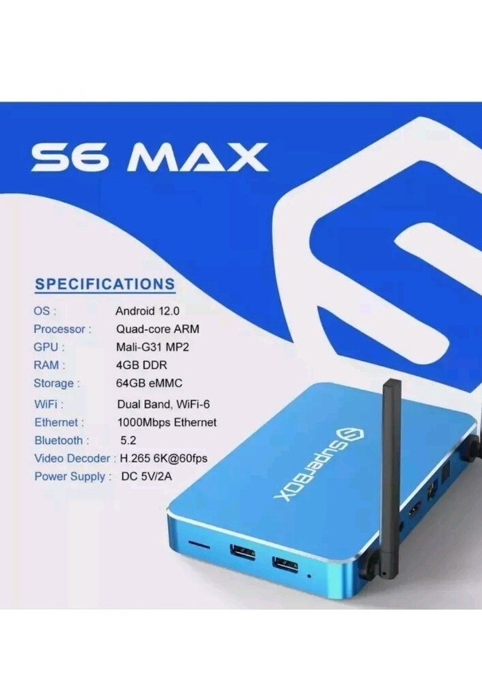 Operating System: Android Generation: 6th Generation Audio/Video Outputs: HDMI Storage Capacity: 64 GB gtin13: 715787209545 Manufacturer Warranty: 1 Year Features: Wi-Fi Type: Tv Box Model: S6 Max MPN: S6 Max Color: Blue Product Line: SuperBox Country/Region of Manufacture: China Year Manufactured: 2025 Brand: SuperBox Surround Sound Formats: Dolby Digital Connectivity: Ethernet Port, HDMI, HDMI Port, Memory Card Slot, USB Port, Wi-Fi, Bluetooth Maximum Resolution: 2160p Processor: Quad Core UPC: 715787209545