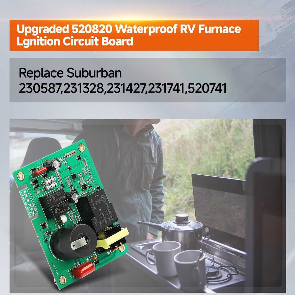 NEW 520820 Furnace Heater Fan Control Ignition Circuit Board Replace Suburban RV Part Number:520871 520814 520820 33550L AP4896608 Feature: 【Safety Protection】1. Detect the flame when it is powered on 2. Detecte the temperature, flame, and airflow during work3. Enter the locking protection and manually reset it when abnormal flame extinguishing is detected. 【OEM Standard】Circuit board RV Ignition Control Board Kit adopts Germany SMT technology to ensure more stable and reliable.Through multiple processes of quality inspection before leaving The atwood furnace parts factory, to ensure The product quality. 【Quality Assured】1 Year Unlimited--We extremely value your satisfaction and strive to provide you good shopping experience. Any product question, please feel free to contact us at any time. Fitment: Compatible with: SF20/25/30/35/42; SF20F/25F/30F/35F/42F USE 520832 WIRE KIT ; NT24/30/34SP; NT40 USE 520839 WIRE KIT ; NT12/16/20S; NT12/16/20SE USE 520840 WIRE KIT ; DD17DSI WITH DATE CODES BELOW 9124 USE 520612 ; DD17DSI WITH DATE CODES ABOVE 9124 USE 520741 On Nov 8, 2025 at 22:35:00 PST, seller added the following information: