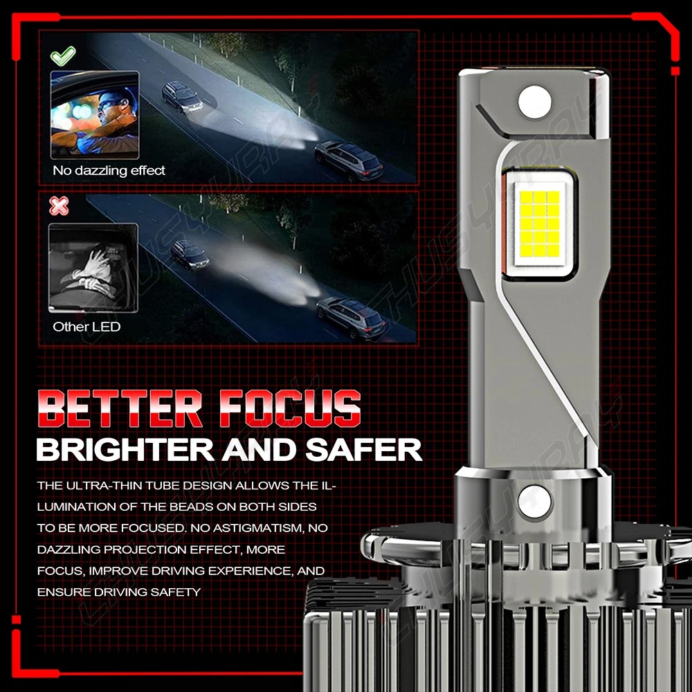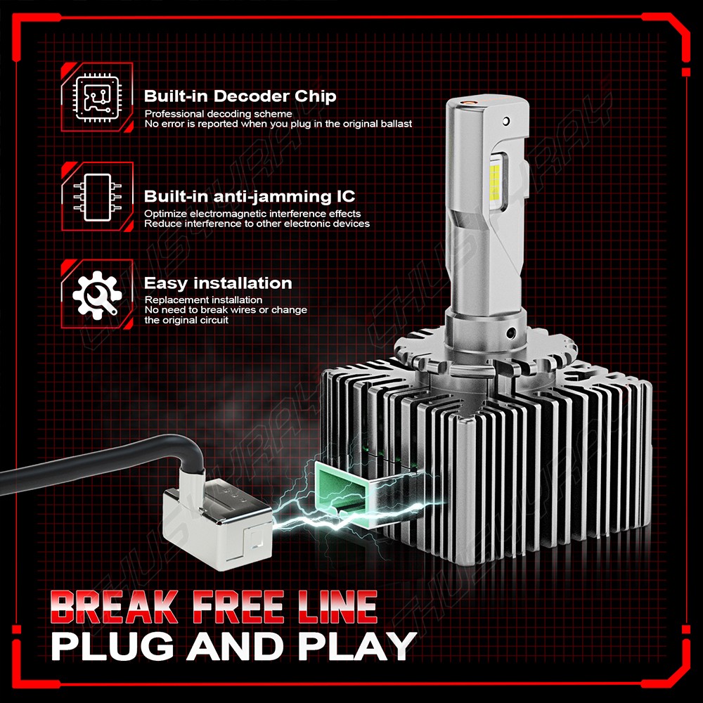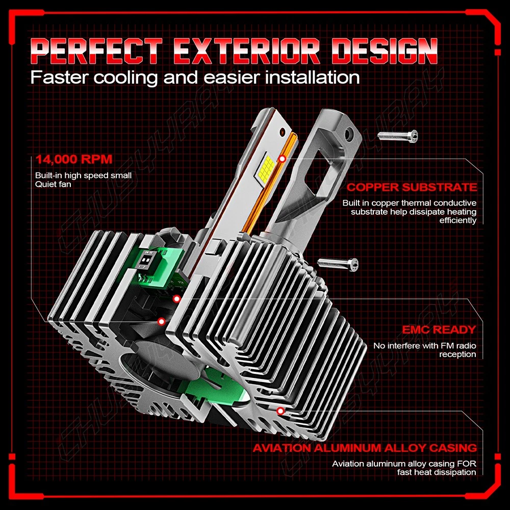 Product Features: Plug and play design, no cutting wire on original ballast. Easy Installation like Bulb: This LED Headlight is compatible with the original xenon HID ballast, plug and play. Does not need to make any changes to the wire cable. Super Brightness: Our LED Headlight Bulb with 200% brighter than original xenon bulb, 6000K white, improve visibility of night driving, it starts instantly in 1 seconds, make driving safer. Upgrade Cooling System: Our LED Headlight has a durable aluminum body, built-in more powerful high-speed cooling fan, intelligent and efficient cooling capacity, ensuring ultra-low temperature, and a life of up to 50,000 hours. Specification: Bulb Size: D3S/D3R Power: 90W/pcs, 180W/set Light Source: Big Chip LEDs Color Temperature: 6000K White Luminous Flux: 10000LM/pcs, 20000LM/set Materials: Aviation Aluminum Waterproof Grade: IP67 Lifespan: 50000 hours Package Included: 1 Pair D3S D3C D3R LED Headlight Bulb (2 bulbs)