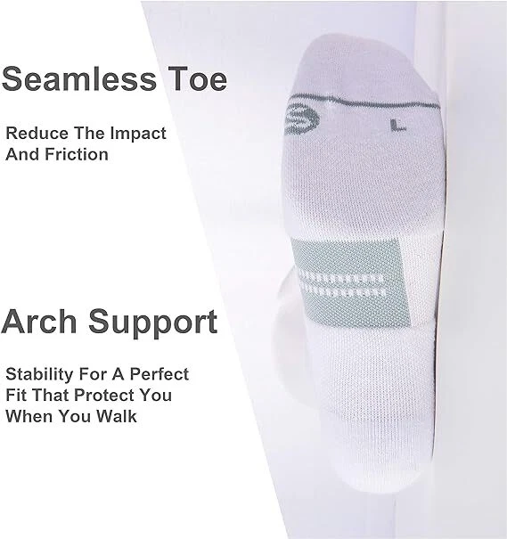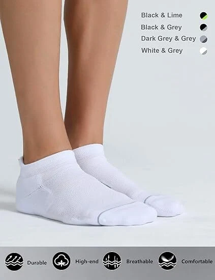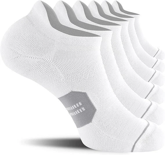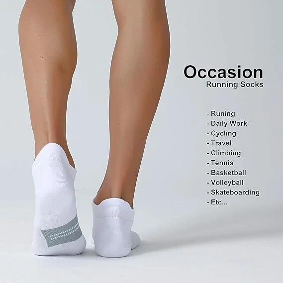 About this item Breathable: These running socks are made of combed cotton, help quickly absorb moisture and release sweat, mesh ventilation in arch can release the heat and keep your feet dry all day. The sports socks are in great stretch and recovery. You can wear these athletic socks for a long time not worrying about the easily broken problem. Friction & Shock Protection: Our ankle socks use the seamless toe design, reducing the friction between toes and shoes to prevent blister. Cushion on the toe and in bottom with thicker yarn , reduces the impact of friction when your move. These low cut socks are fit for men that are also the best choice for running, walking, playing all kinds of balls, outside and inside activities. Non Slip Off: Our tab socks have suitable compression in arch to protect you when you walk, jog and run and increase stability for a perfect fit. Elastic cuff tab can lock the heel and make sure our sports socks non-slip in order to prevent athletic sock sliding from your daily walking, running, cycling, hiking, tennis. One size: Fits mens size 6.5-12, womens size 8-13.5