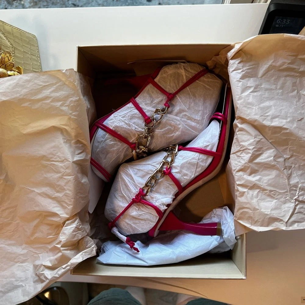 NEW AJE Astrid Chain-embellished Leather Sandals In Fuchsia Sz 39 Chain-embellished Open pointed toe Sculptural heel Ties at ankle Leather sole Imported Includes box, certificate of authenticity and dust bag. Designer size 39 = US 9