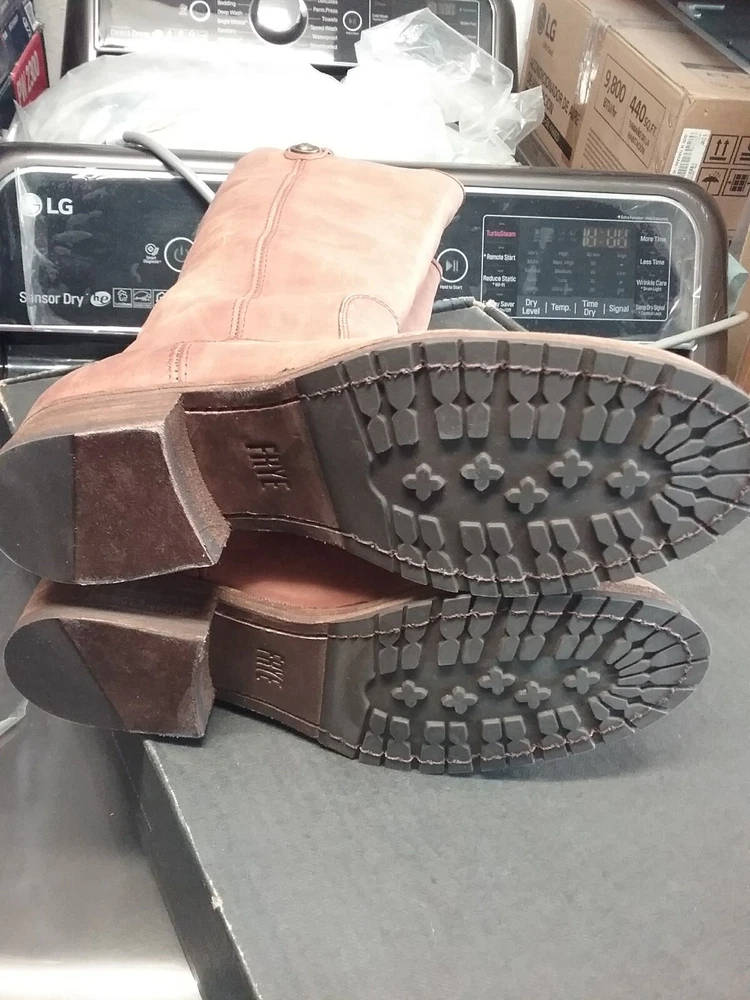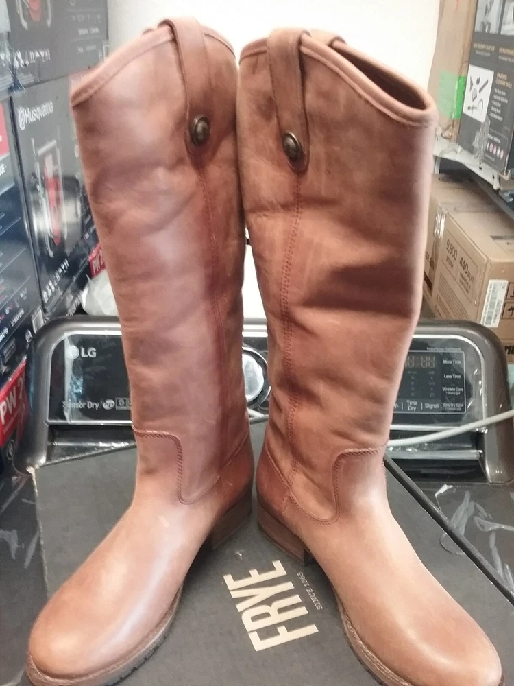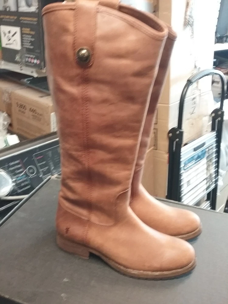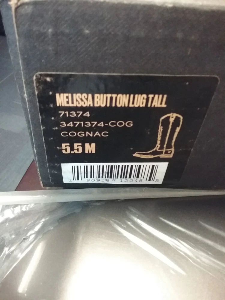 NEW AND BOX FRYE WOMENS BOOTS MELISSA BUTTON LUG TALL SZ 5.5 M.. color cognac .