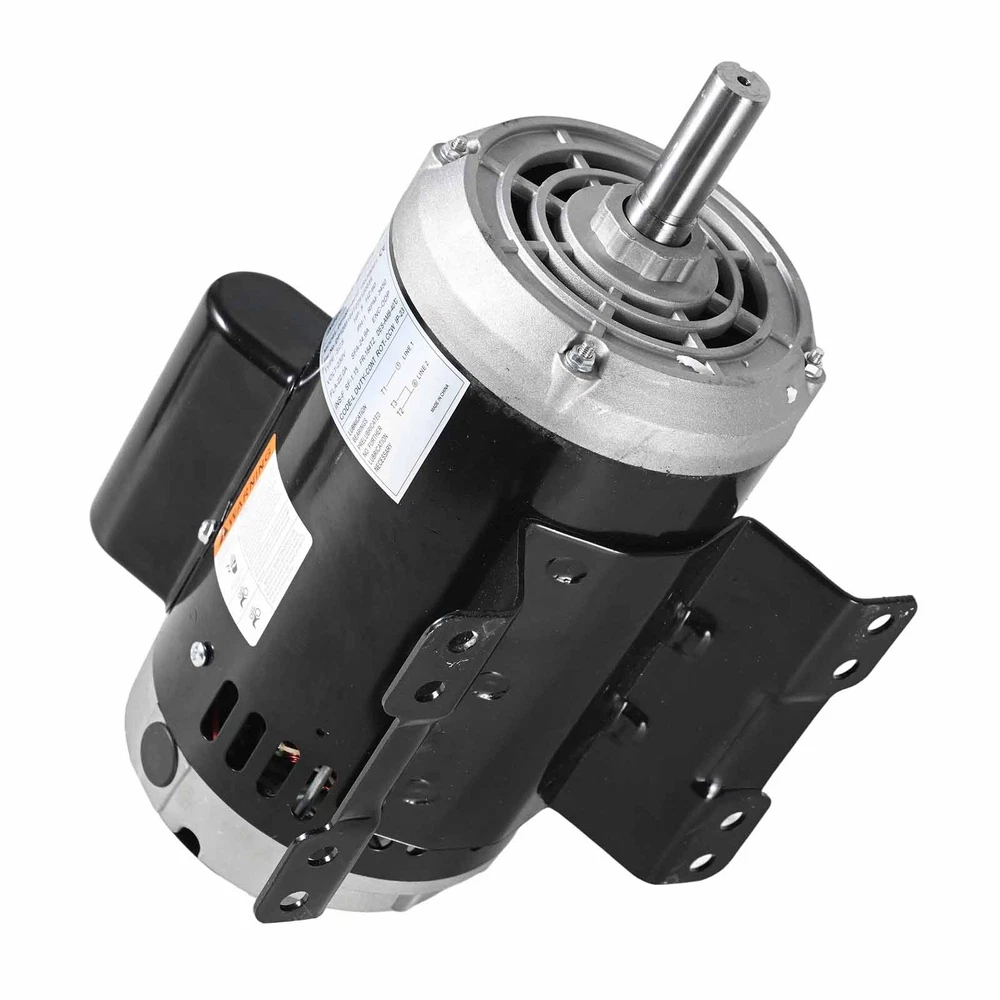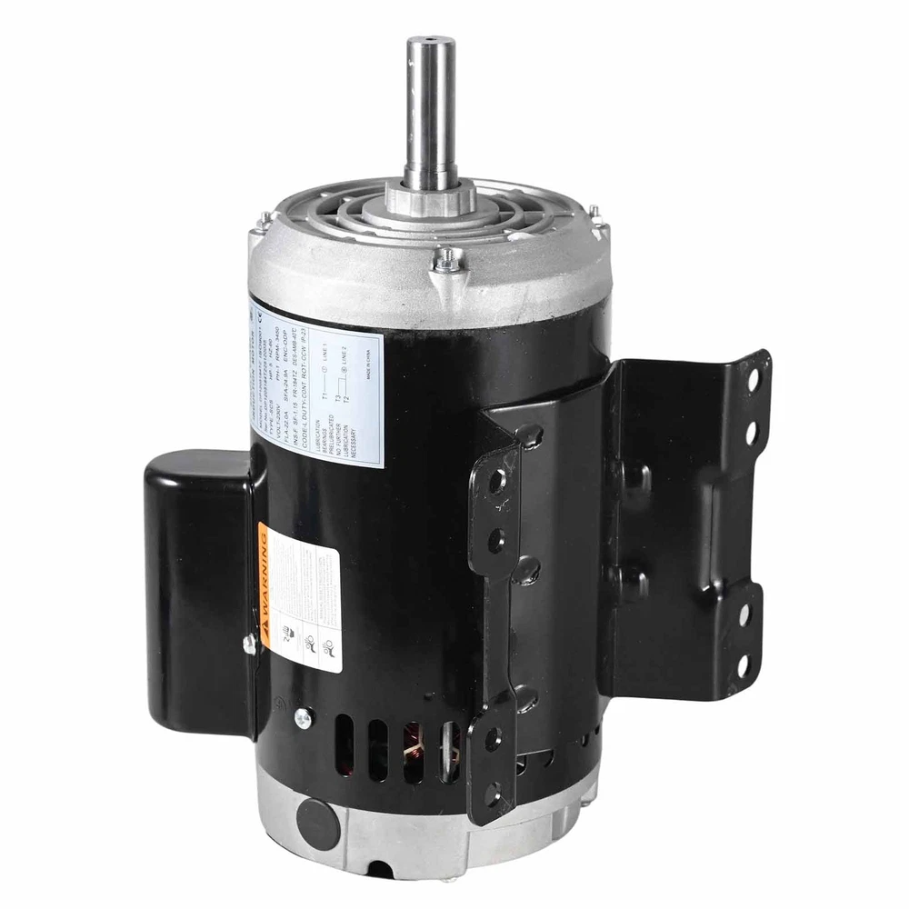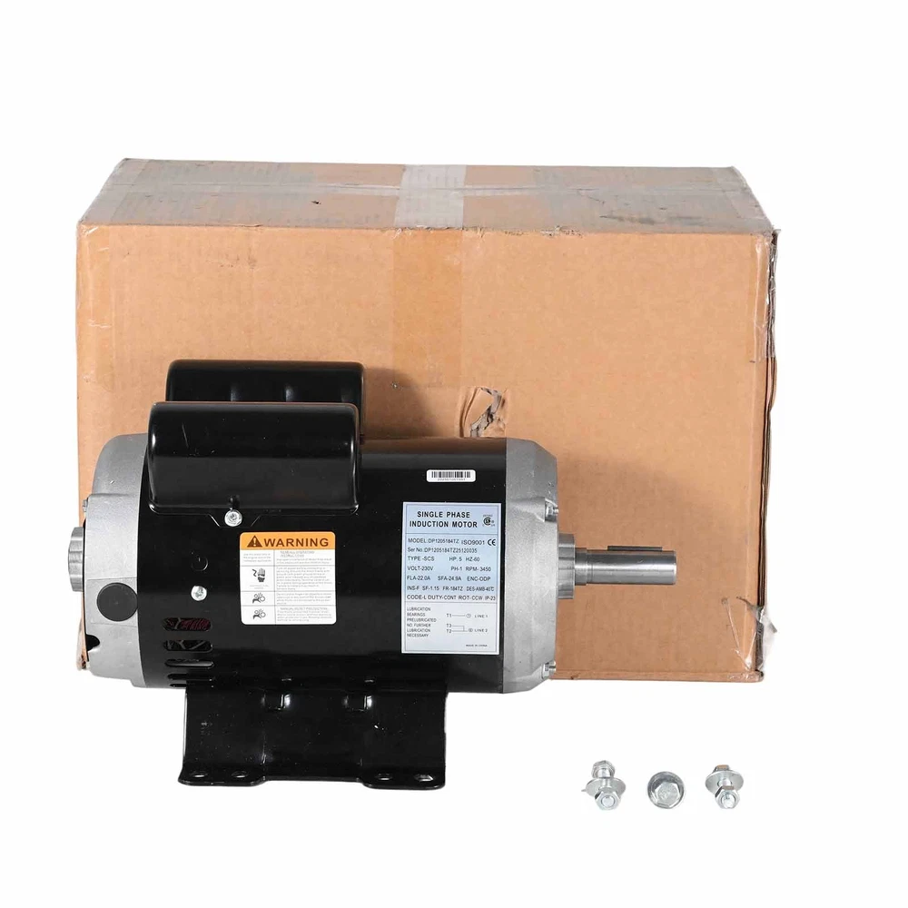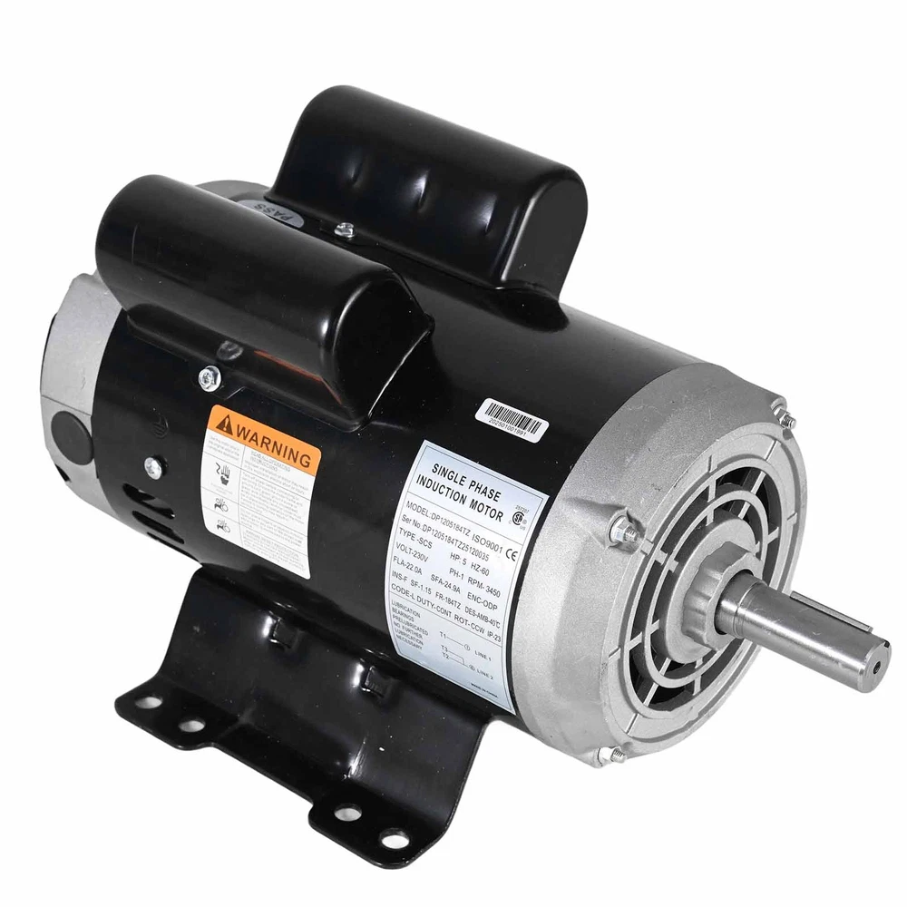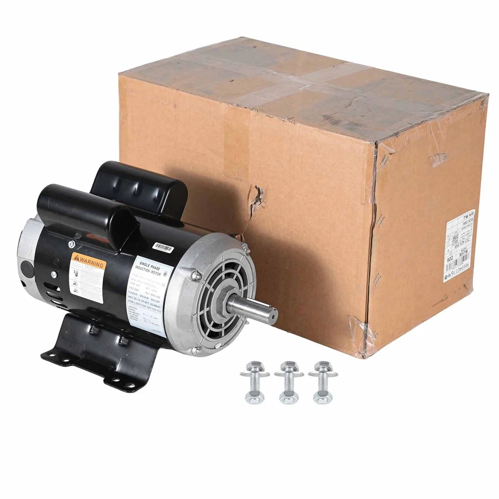 NOTES Confirm your motor name plate data tag including voltage, amperage, speed, frame and shaft diameter to match this motor specifications for proper operation. When the motor is received, 1. Turn the shaft by hand to see if the motor shaft can rotate normally. 2. Do not run with load first, run the machine for a few minutes, and then bring the load after everything is normal. 3. When running with load, it is best to use an ammeter to measure the actual running current and see if it exceeds the rating on the nameplate. SPECIFICATIONS Power 5 HP FLA 24.9 SFA 27.3 RPM: 3450 Frame: 184T Shaft Size: 7/8" x 2 1/4" with Keyway Shaft height: 4.5" (Measured to Shaft Center) Base: Flat Rigid Mounting Base Voltage: 208-230V 60hz, 24.9 AMPS Phase: Single Phase Service Factor: 1.15 Insulation Class B Ball Bearings Open Drip Proof Enclosure Manual Overload Protection PART NUMBERS 23378805 56283138 23220064 54421193 FEATURES Brand new, high starting torque design for compressor duty applications. Overload protection with manual reset. Steel frame and base. Welded base. Capacitor start/capacitor run.