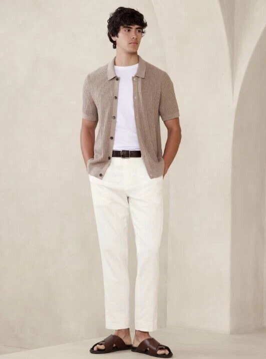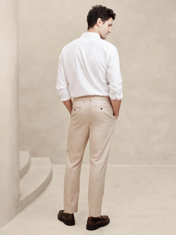 Banana Republic Tailored-Fit Linen-Blend Trouser in Ecru (FIRST PHOTO)...new with tag NOTE: size tag of 36/32 incorrect - inseam measures 30" LINEN-BLEND: This light and breathable fabric is a must for those warm days and styles effortlessly for all occasions. Our customer-favorite linen-blend trouser is back, now accompanied by a matching jacket to complete the full suit look. Hook-and-bar closure with zip fly. Belt loops. Front off-seam pockets. Double welt buttoned back pockets. Soft trouser crease. Matching suit jacket available. Made exclusively for Banana Republic Factory. #878307 Tailored through the thigh. Tapered leg opening. Inseam: Extra Short 26"; Short 28"; Regular 30"; Long 32"; Extra Long 34" 55% flax (linen), 43% cotton, 2% elastane spandex. Dry clean. Imported. ***Inner tag marked***