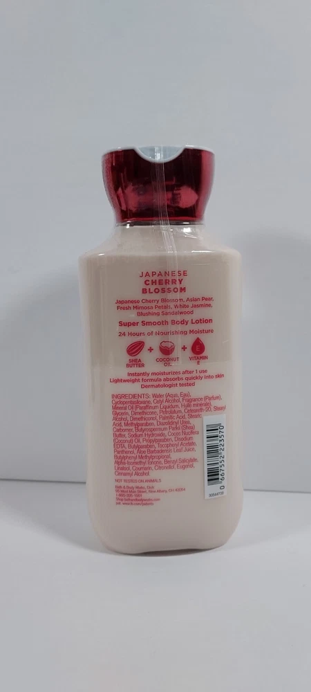 Features: Contains Aloe Vera, Hydrating, All Natural Ingredients, Alcohol-Free, Animal Cruelty-Free, Contains Minerals, Contains Ceramide, Ammonia-Free, Colorant-Free, Contains Vitamins Size: Regular Scent: Japanese Cherry Blossom UPC: 0667552223570 Active Ingredients: Aloe Vera Color: White Volume: 8 fl oz Main Purpose: Moisturizer Product Line: benefit Total Moisture Size Type: LARGE Formulation: Lotion, Butter, Cream, Mist, Spray Type: Daily Use Department: Unisex Country/Region of Manufacture: United States gtin13: 0667552223570 Body Area: Decollete, Arm, Full Body, Hand, Feet, Leg Skin Type: All Skin Types UVA Protection: 5-Star Ingredients: Shea Butter, Coconut Oil, Coconut, Aloe Vera, Cocoa Butter Fragrance Name: Bath and Body Works MPN: W-BB-3154 Brand: Bath & Body Works Sun Protection Factor (SPF): SPF 0