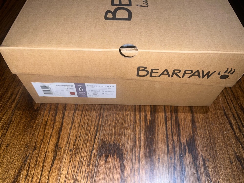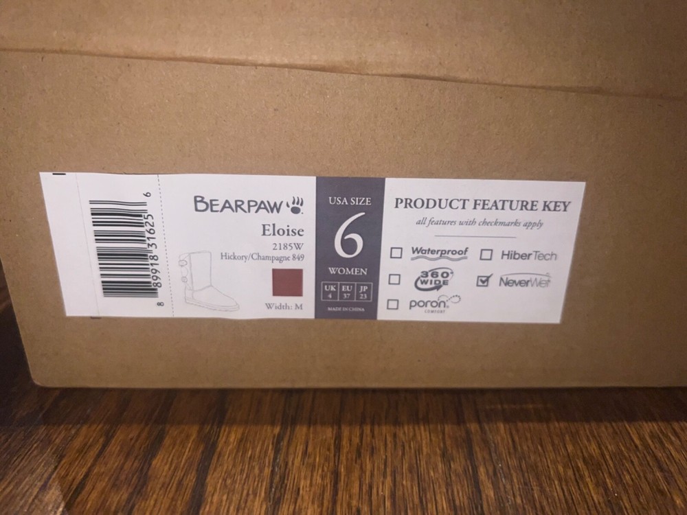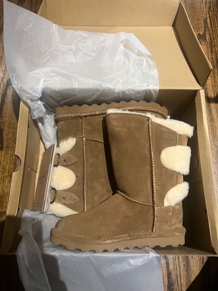 Brand new in original box! Size: Women's Size 6 Medium Width Color: Hickory/Champagne Double d-ring straps cinch the back of this smart suede boot on BearPaw's new slimmer design construction with fuzzy faux fur or wool blend accented back panel. Treated with BearCoat™ Rain & Stain Repellent. Features: -Suede, faux fur upper -Decorate buckle details -Pull-on, Buckle -Wool blend lining -Comfort sheepskin footbed -Lightweight blown rubber outsole -Treated with BearCoat™ Rain & Stain Repellent -8" shaft height -12" circumference
