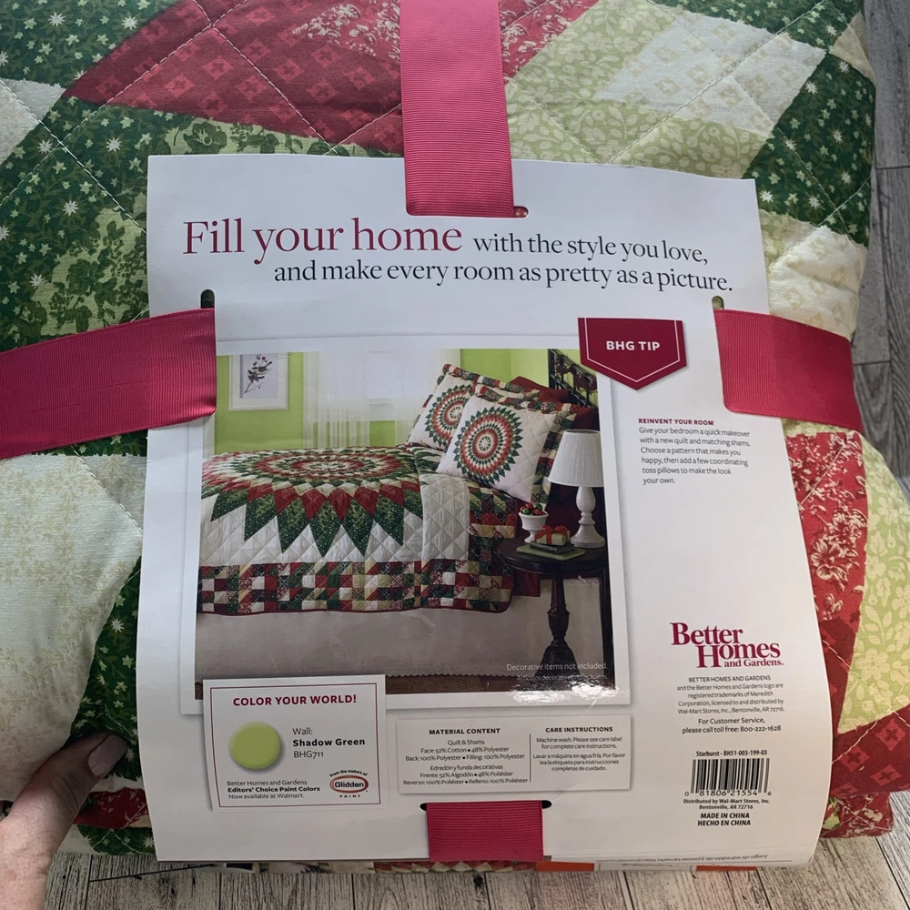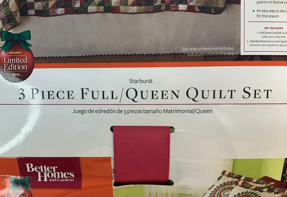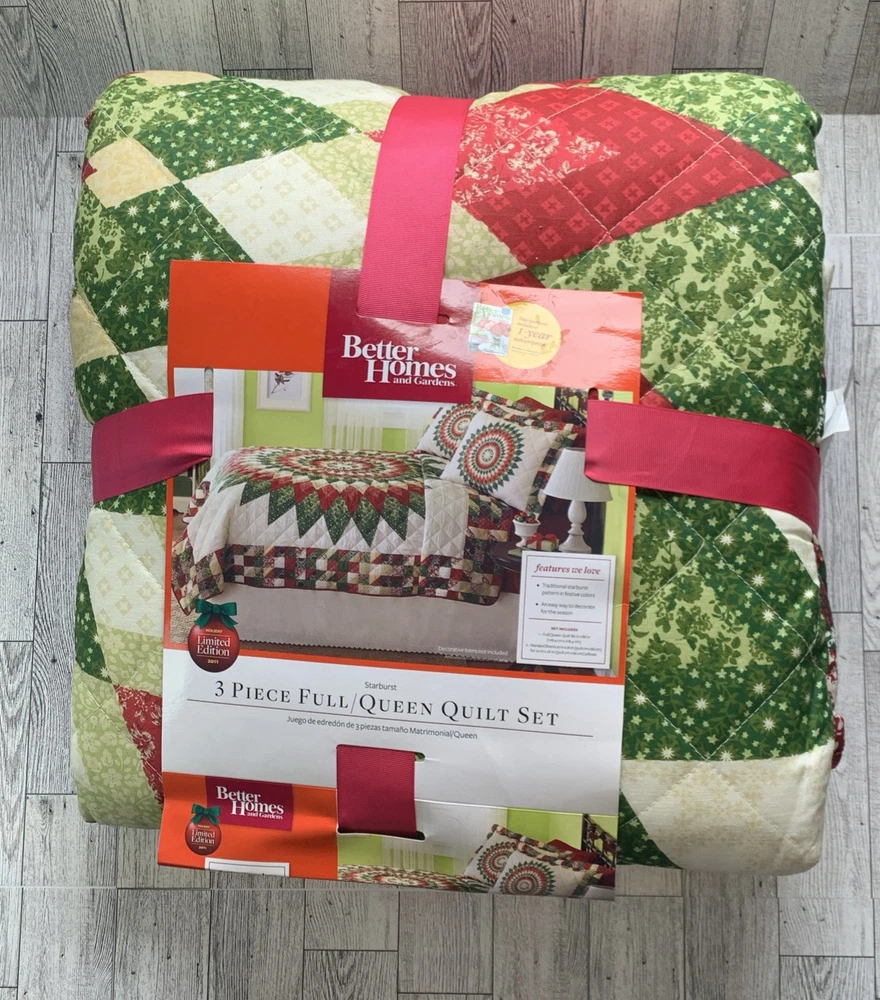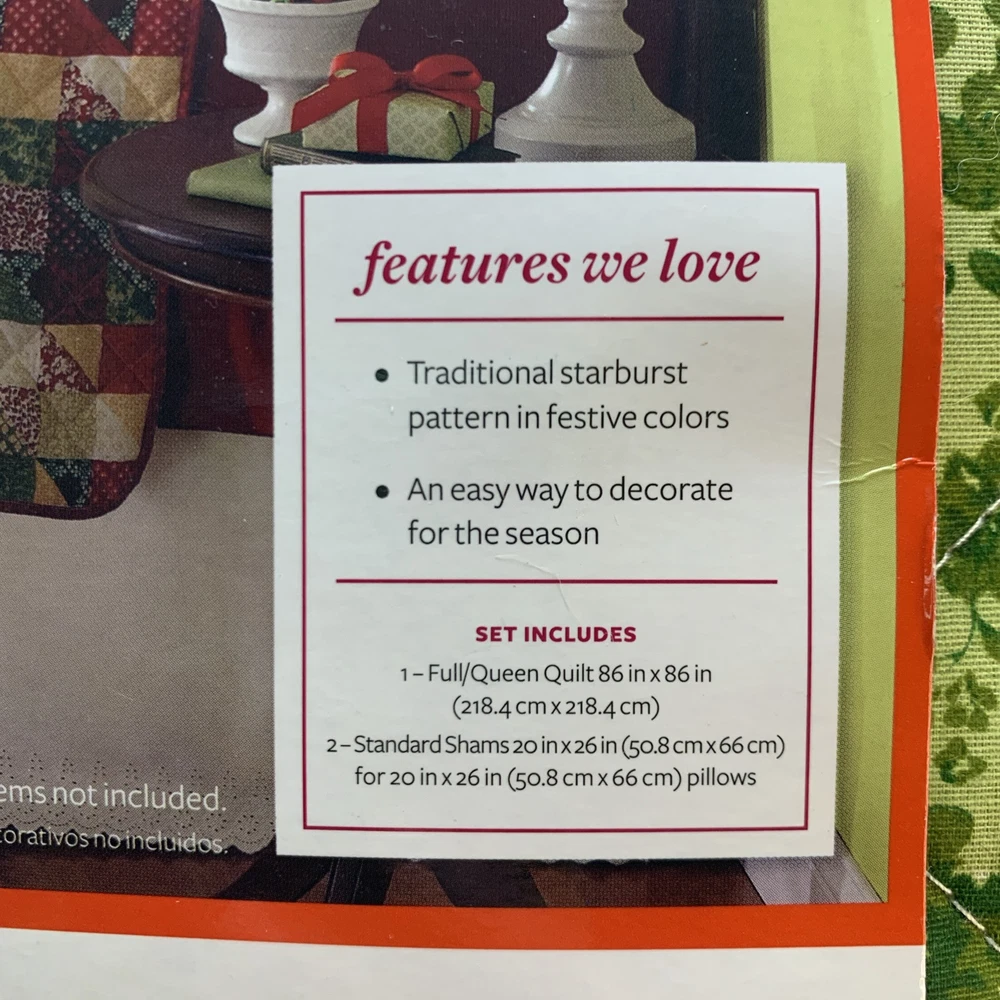 Limited Edition 2011 Holiday Set. 1 Full/Queen quilt size 86X86 and 2 pillow shams size 20X26. Starburst pattern in Christmas colors of red and green. Still in original packaging. See photos. Offers happily considered! Thanks for looking in Granny's Shop!