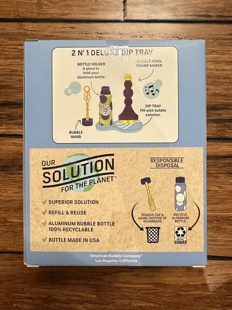• 1-4 fl. oz. prefilled bubble bottle made from 100% recyclable aluminum that can be refilled. • Custom design wand affixed to cap of aluminum bottle. • 2 N’ 1 deluxe dip tray. Provides 1 space to hold aluminum bubble bottle and another space to hold bubble solution and sound maker bubble flute. • Sound maker bubble flute blows bubbles and makes sound at the same time. • Age grade 3+
