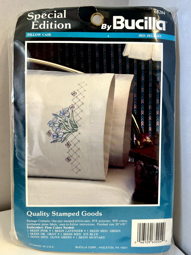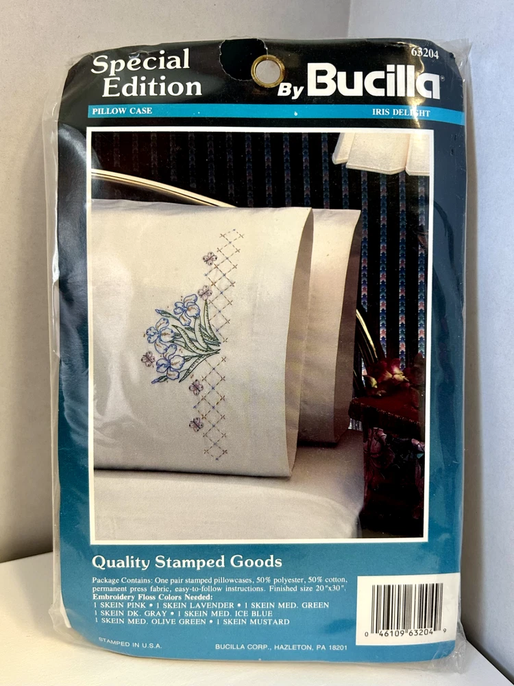 NEW IN PACKAGE Bucilla Special Edition Iris Delight Stamped Cross Stitch Pillow cases kit. Stock #63204 Kit includes: two stamped pillowcases and instructions.