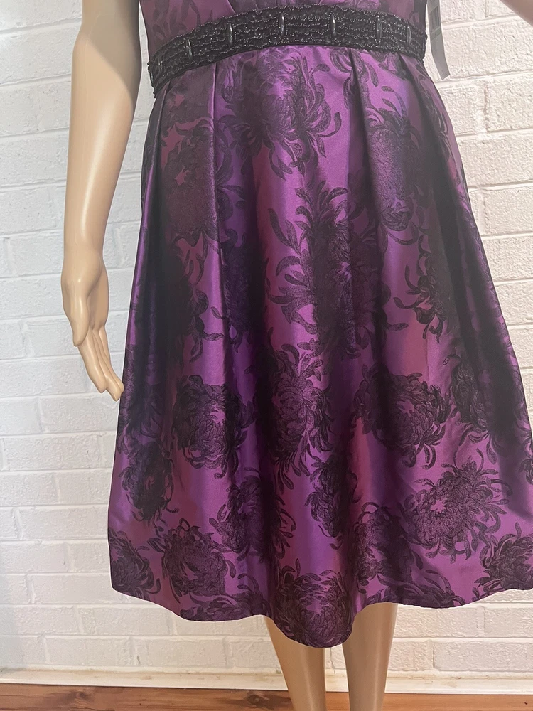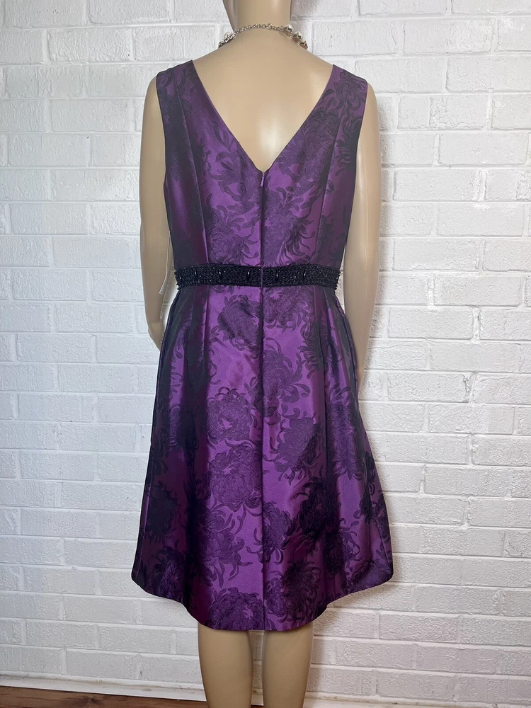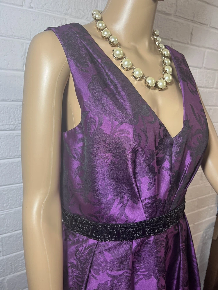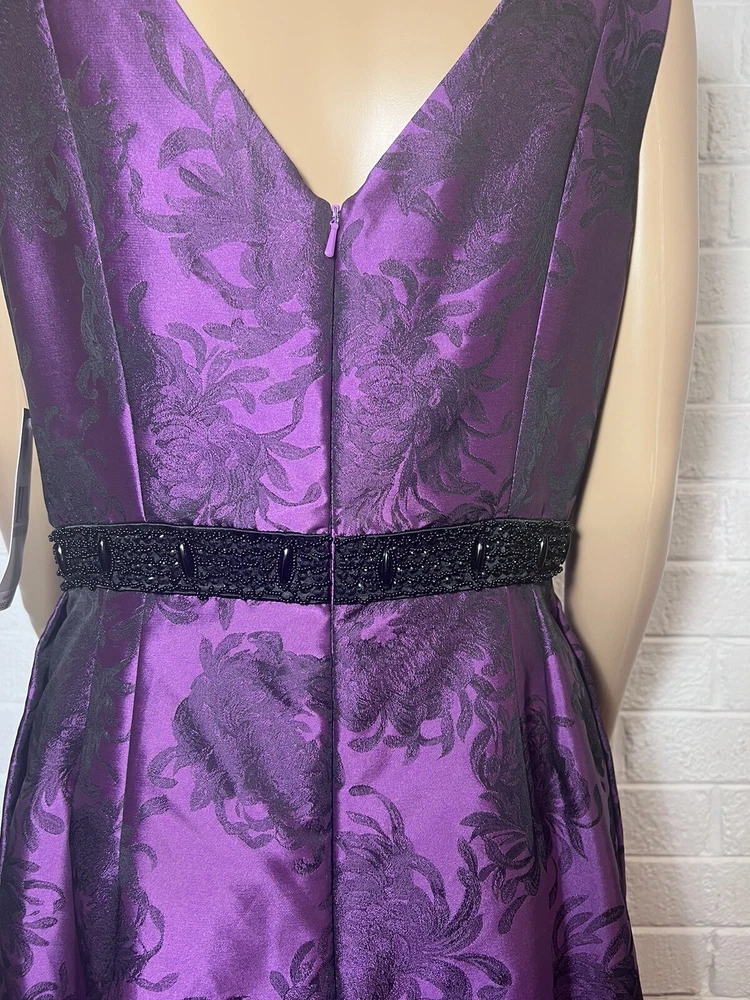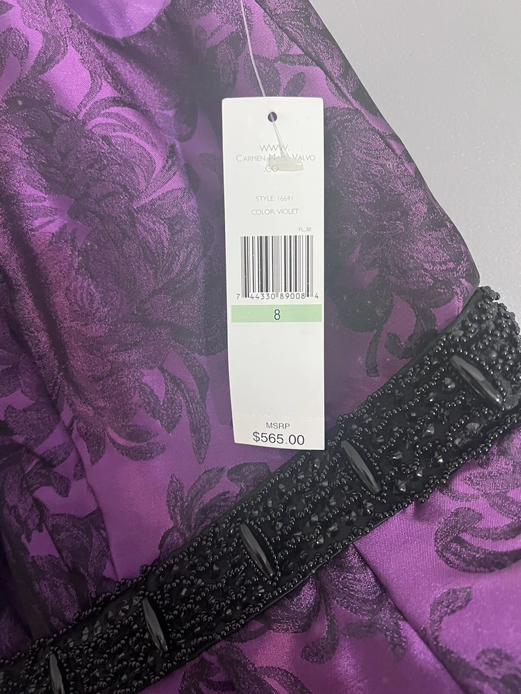 NEW CARMEN MARC VALVO Collection Vintage Dress Purple Size 8. This is a beautiful cocktail dress in a purple and black brocade fabric with black beading around waist. And it have pockets. Carmen Marc Valvo is a Luxe evening formal and cocktails dress designer . Retail price was $565 A3
