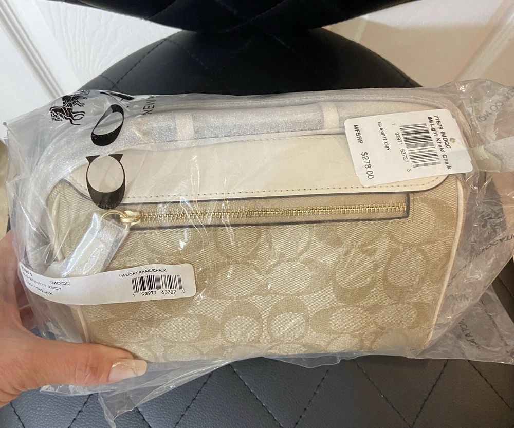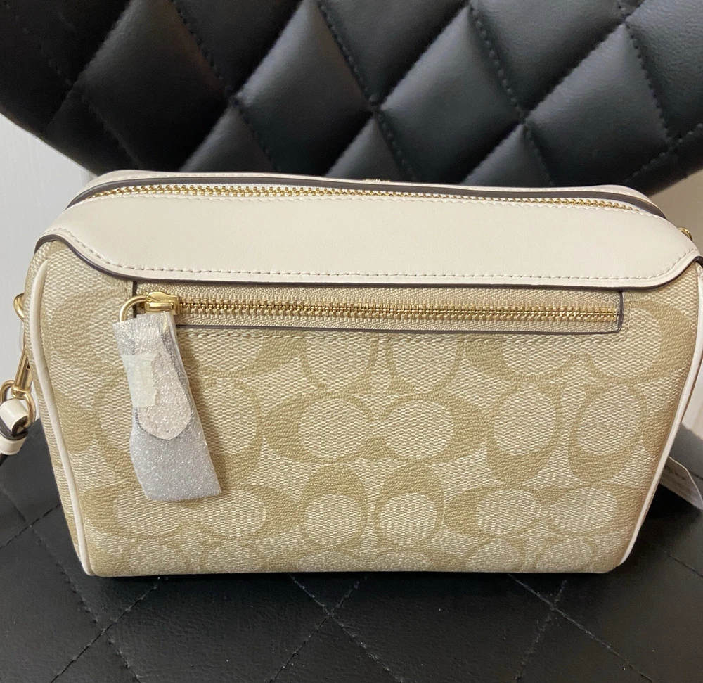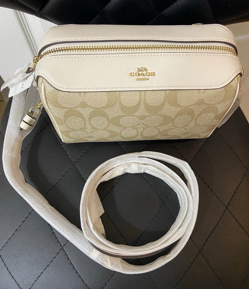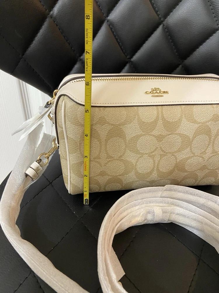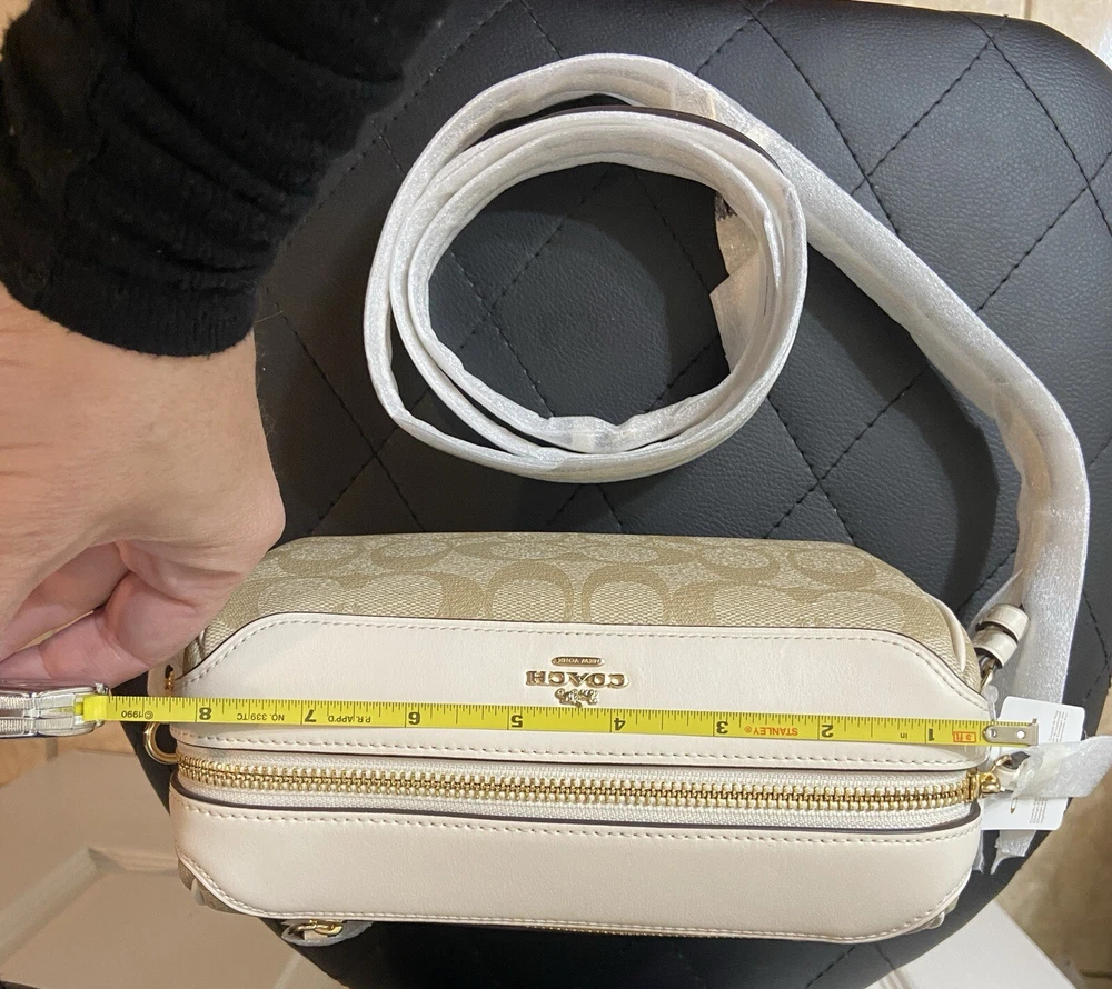 Elevate your accessory game with this stunning Coach Bennett Crossbody bag in Light Khaki/Chalk. Crafted from high-quality coated canvas and leather, this bag boasts a chic and classic design that will complement any outfit, whether it's for travel, party/cocktail, casual, formal, or business occasions. The bag features a gold hardware color and a signature C logo pattern, giving it a touch of elegance. The adjustable strap, detachable strap, brand card, and bag charm are some of the fabulous accessories that come with this bag. The bag has a rectangular shape and a zipper closure. It has a small size, measuring 9.75 inches in width, 6.5 inches in height, and 4.5 inches in depth. The bag's handle drop is 4 inches, and the strap drop is 25 inches. The lining material is also rayon, and the bag comes in its original packaging.