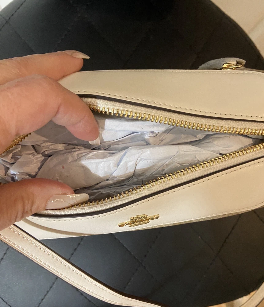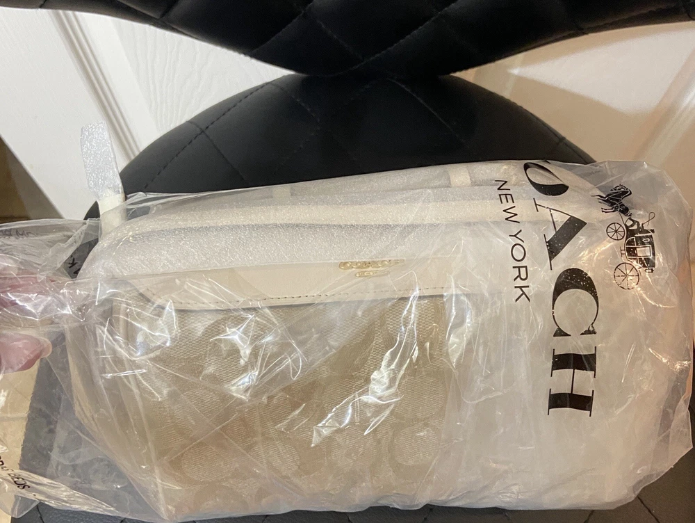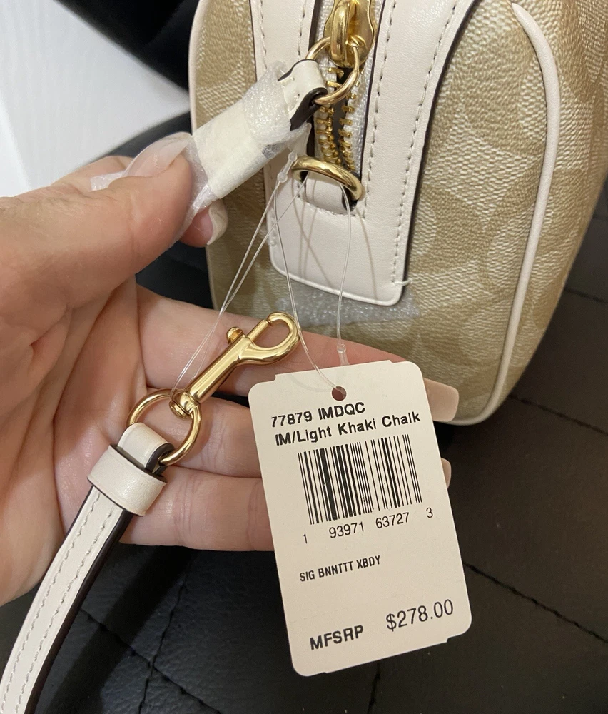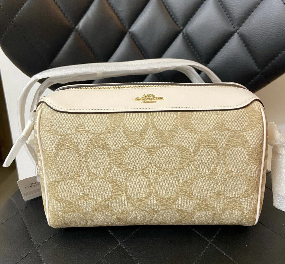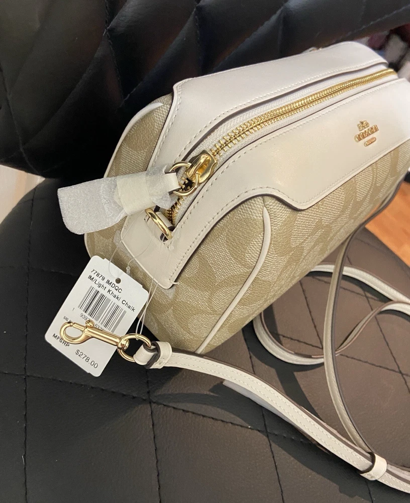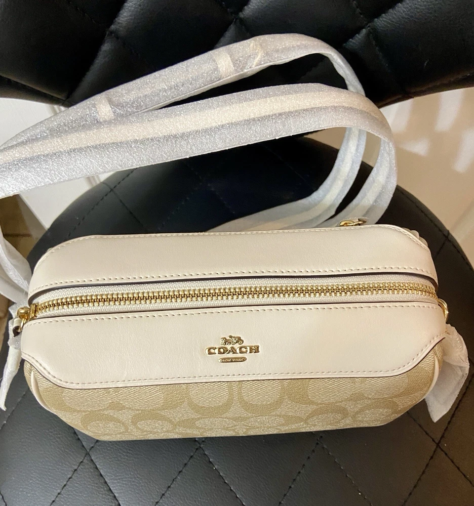 Elevate your accessory game with this stunning Coach Bennett Crossbody bag in Light Khaki/Chalk. Crafted from high-quality coated canvas and leather, this bag boasts a chic and classic design that will complement any outfit, whether it's for travel, party/cocktail, casual, formal, or business occasions. The bag features a gold hardware color and a signature C logo pattern, giving it a touch of elegance. The adjustable strap, detachable strap, brand card, and bag charm are some of the fabulous accessories that come with this bag. The bag has a rectangular shape and a zipper closure. It has a small size, measuring 9.75 inches in width, 6.5 inches in height, and 4.5 inches in depth. The bag's handle drop is 4 inches, and the strap drop is 25 inches. The lining material is also rayon, and the bag comes in its original packaging.