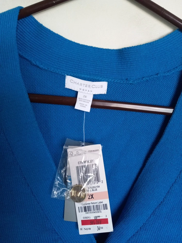 Character: Blue Fabric Type: Knit Department: Women Theme: Metal Style: Henley Color: Blue Type: Sweater Pattern: Solid Size: 2X Material: Cotton Blend Neckline: V-Neck Size Type: Regular Accents: Button Brand: Charter Club Sleeve Length: Long Sleeve