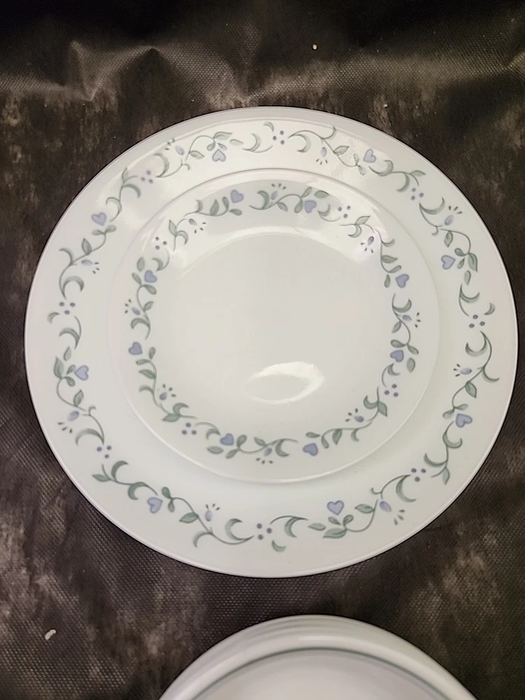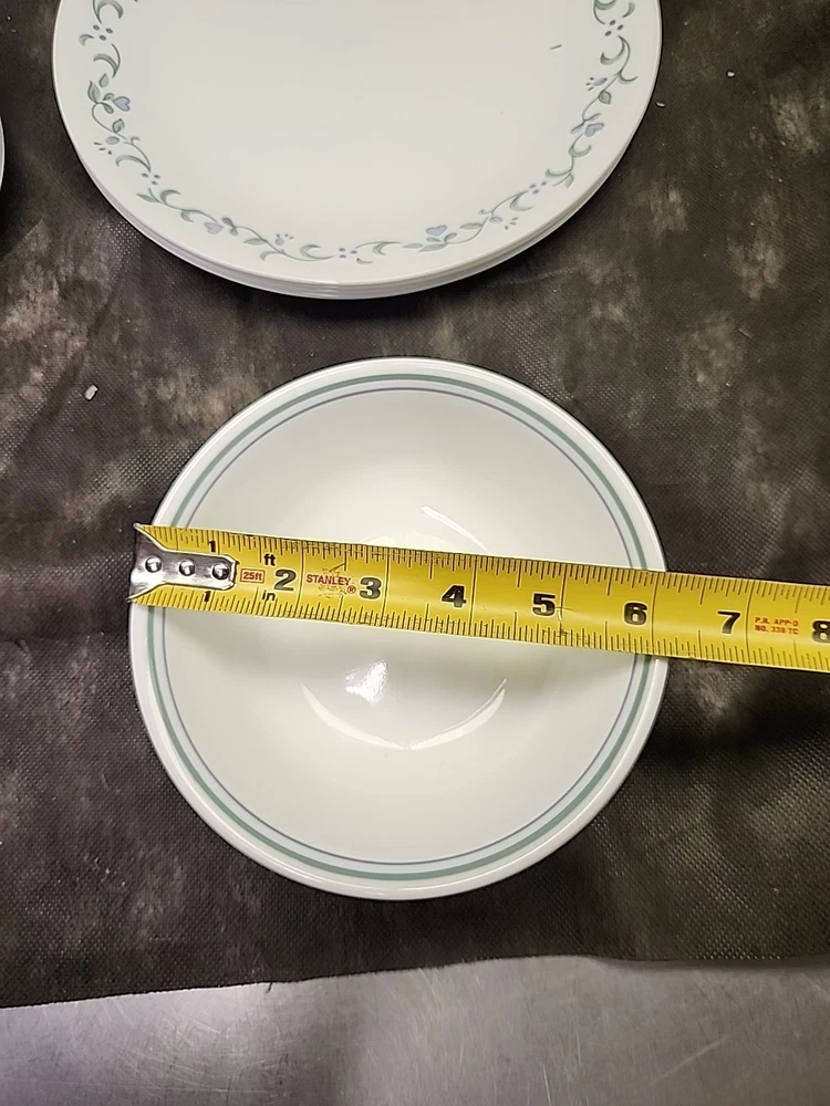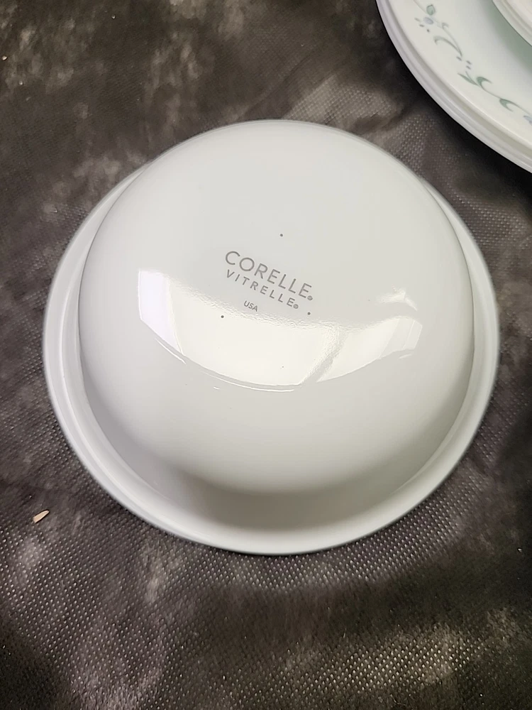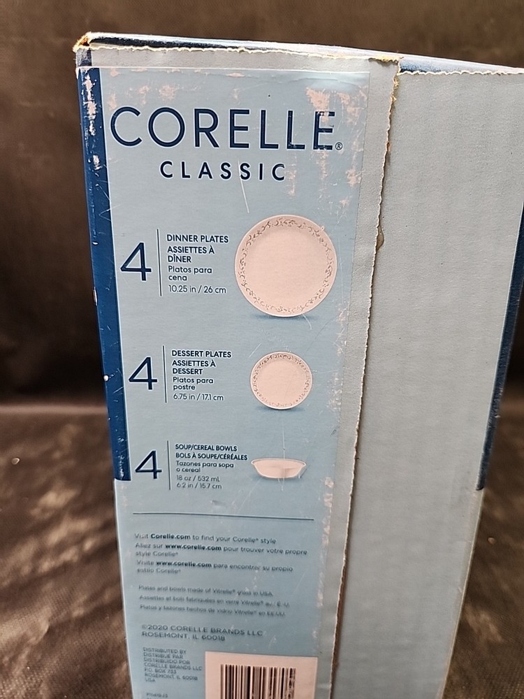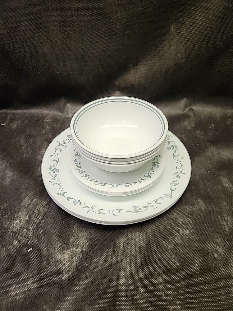 The NEW Corelle Classic Dinnerware set in Country Cottage design features a solid pattern with a round shape and 4 compartments. Made of glass material, this 12-piece set includes dinner plates with a 2-inch diameter. The set is designed for all occasions, with a modern style and features like being microwave, dishwasher, and oven-safe. With its white and green color scheme and country kitchen theme, this Corelle set from the United States is both practical and stylish for any dining table. New, open box